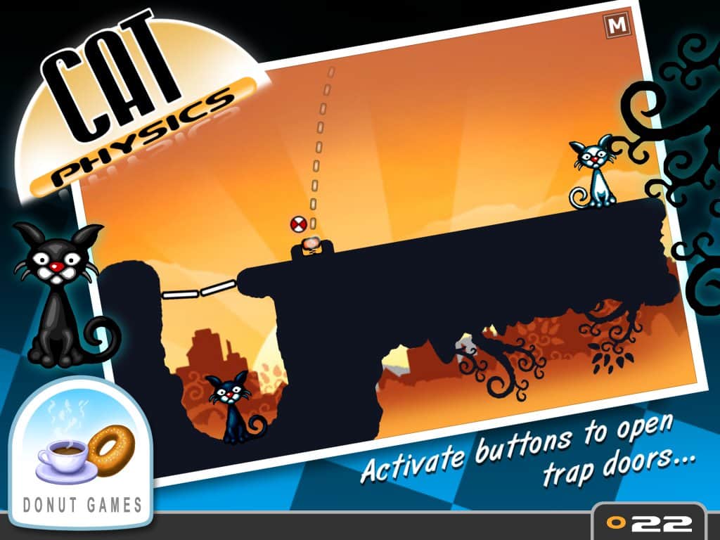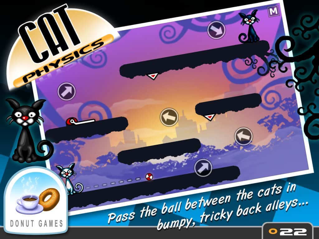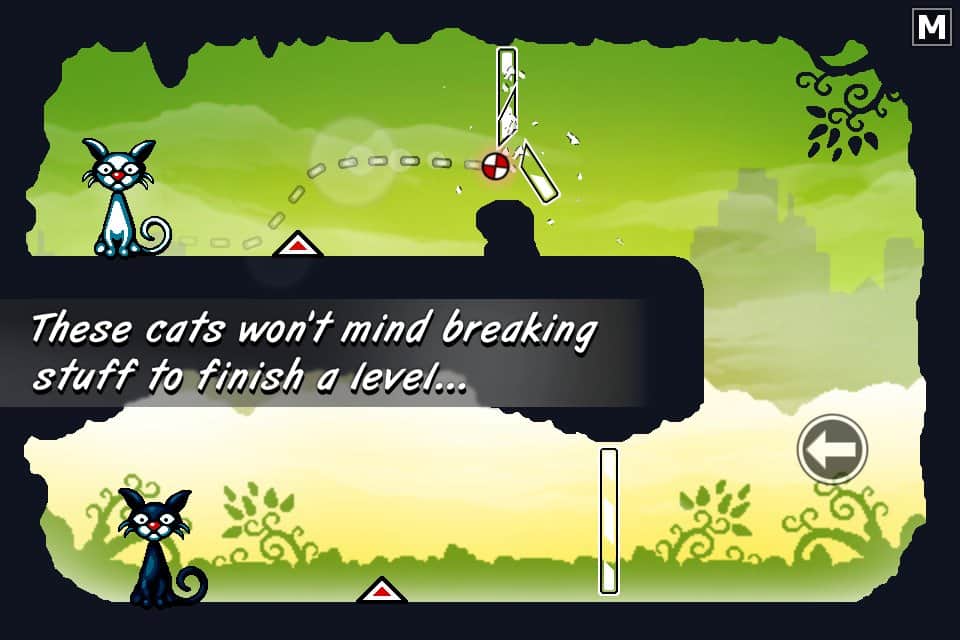 Cat Physics - juego para Android, en el que haces rodar una bola de un gato a otro. Resuelve rompecabezas y supera diversos obstáculos como ventanas de madera, tablones y trampillas que se interponen en tu camino. Tienes oportunidades adicionales para desbloquear.