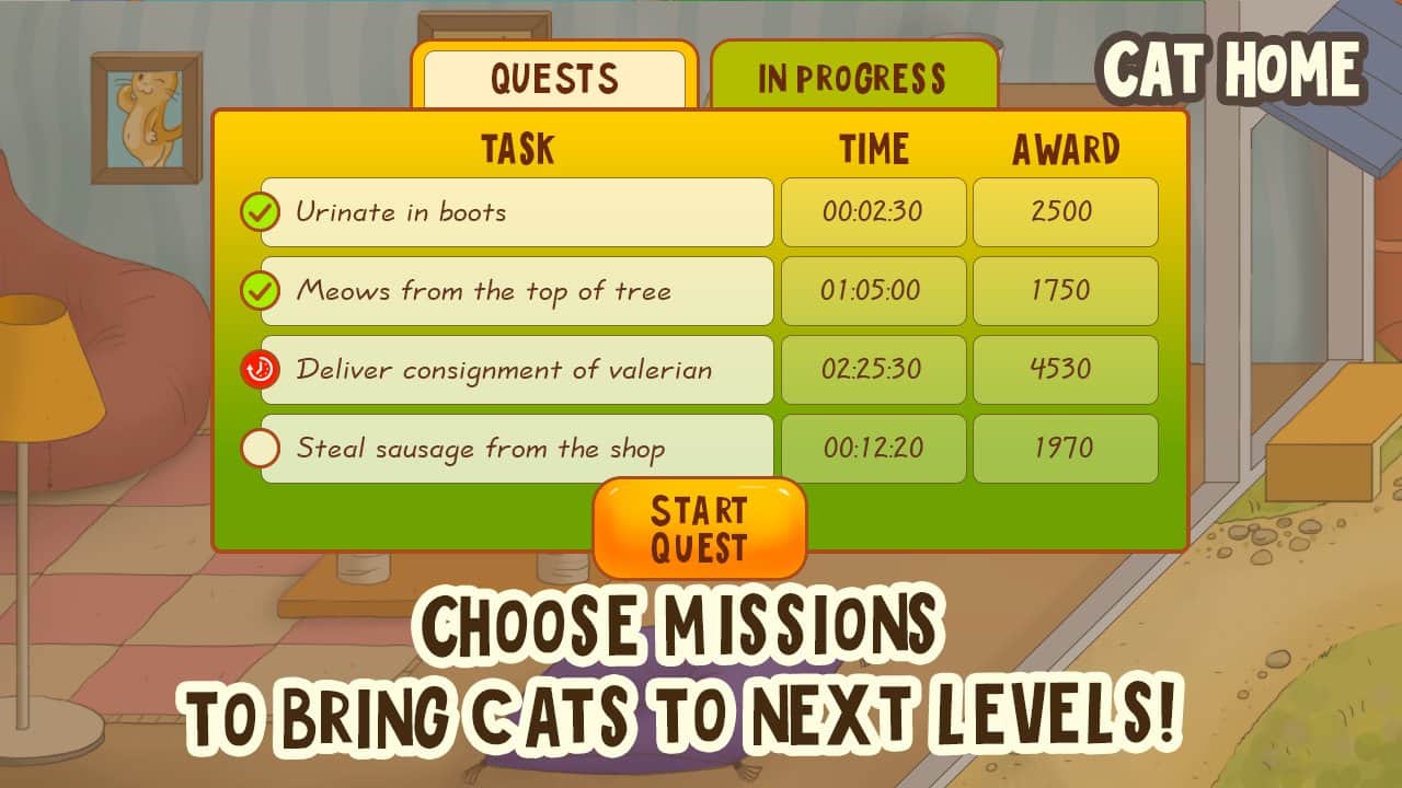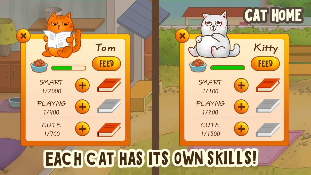 Casa de gatos – un juego en Android donde capturarás el mundo con la ayuda de adorables gatos. En este juego controlarás una casa llena de perros y gatos. Tu tarea será enviar a los adorables gatos a realizar varias misiones en las casas vecinas y en las tiendas cercanas. Rasca los muebles, arruina un zapato de deporte, deslízate desde la cima del árbol, roba una salchicha del carnicero y entrega a tiempo el envío de Valeriana. Realiza las tareas lo más rápido posible y observa cómo tu gato se desarrolla. Absorbe la juguetonería de tus gatos, su inteligencia y su ternura. Asegúrate de que tus gatos estén siempre bien alimentados y bien cuidados. Conquista el mundo y establece un gato en cada casa.
