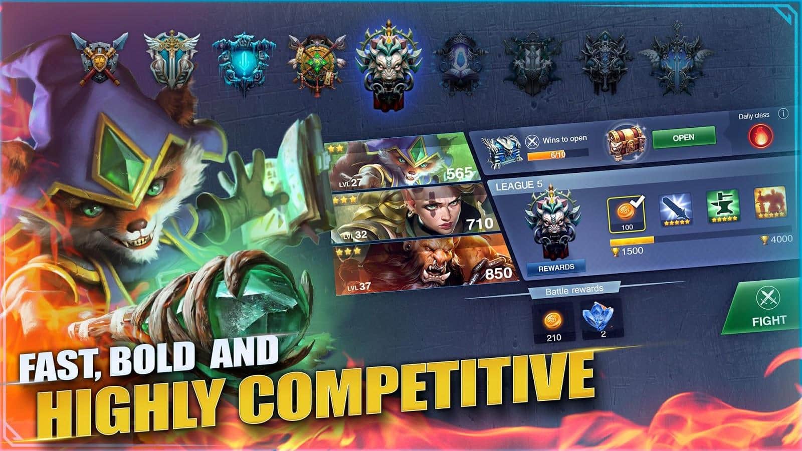 Champions Destiny – MOBA de estrategia para Android donde luchas en batallas en línea. Elige un héroe adecuado en el juego de personajes, cada uno de los cuales tiene habilidades y capacidades únicas. Crea un equipo y lucha en la arena contra jugadores de todo el mundo en batallas PvP de tres minutos. Desarrolla tácticas imbatibles al enfrentarte a otros jugadores en el chat general y trata de destruir la base de los enemigos más rápido de lo que ellos lleguen a la tuya. Mejora tus personajes durante el juego y obtén recompensas valiosas. Participa en torneos diarios por recompensas y bonificaciones valiosas.