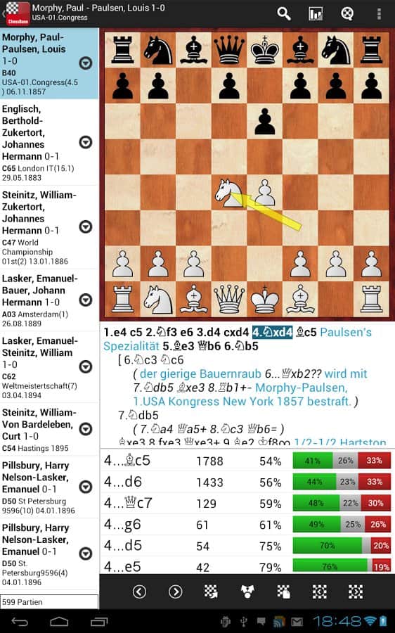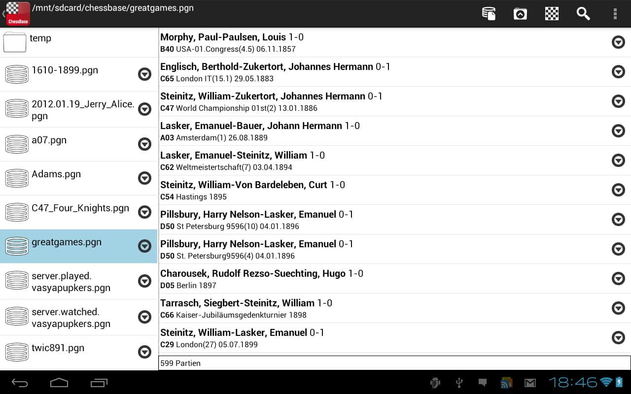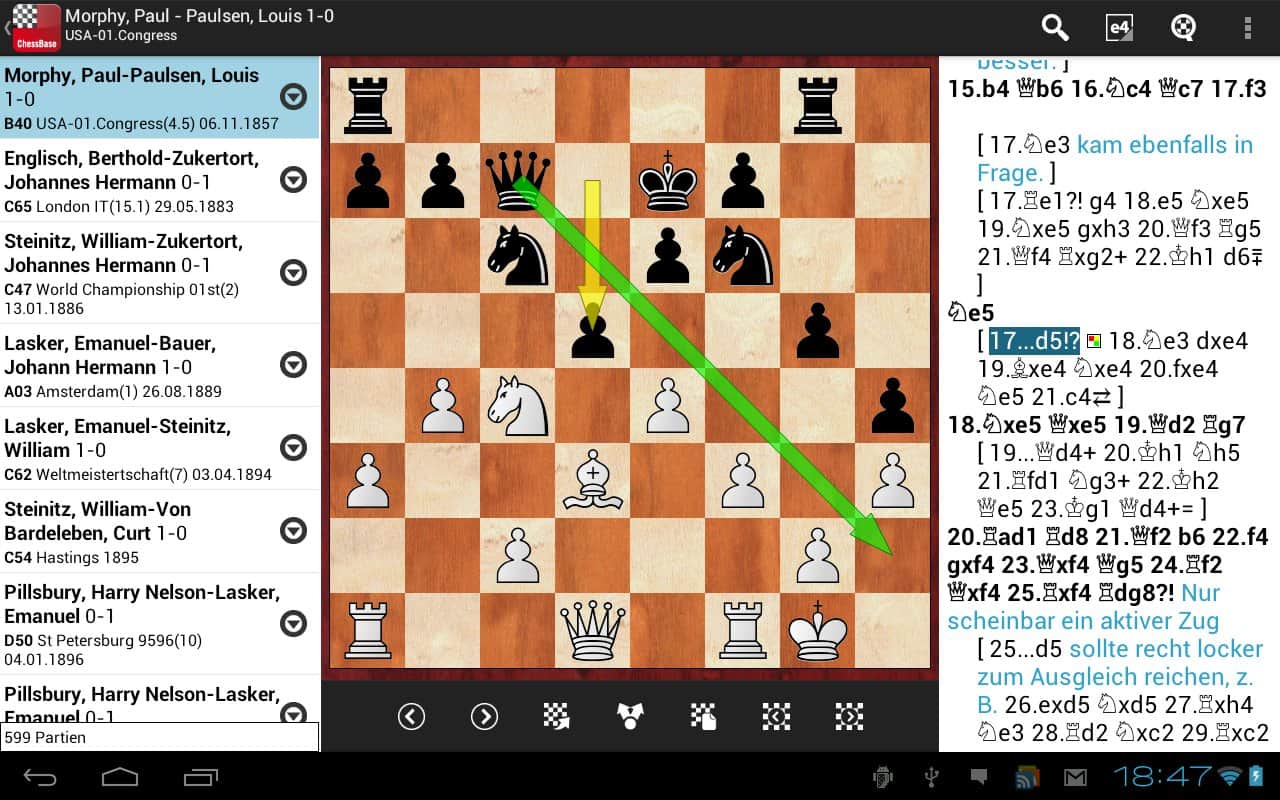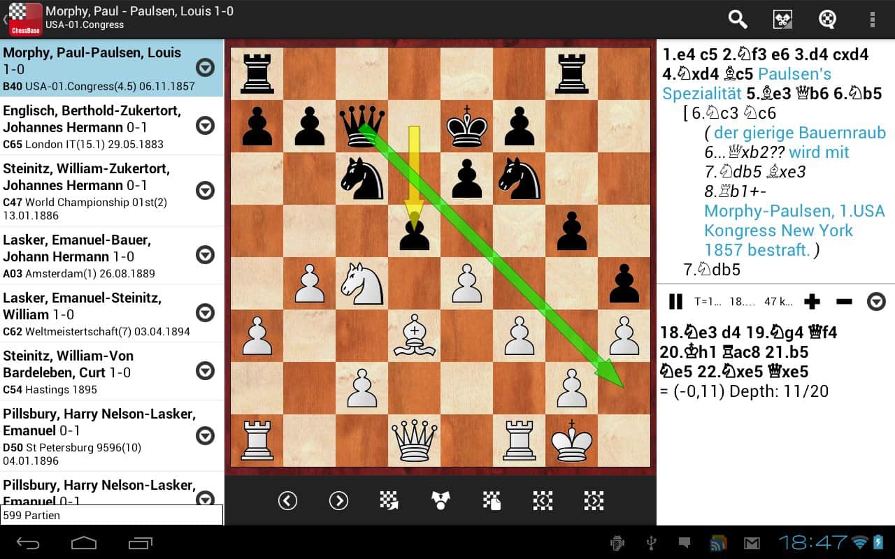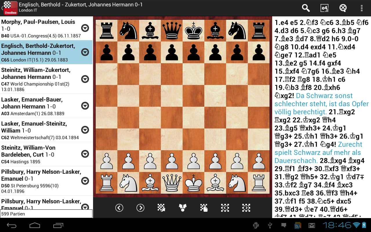 El ajedrez es una de las estrategias de tablero más antiguas, que a pesar de su considerable antigüedad no ha perdido relevancia, y quizás incluso se ha vuelto más popular. A su vez, el ajedrez está muy bien representado en todas las plataformas de juego, incluyendo en dispositivos móviles. También hay proyectos bastante inusuales. Así, una aplicación llamada ChessBase Online es una de las bases de datos de juegos de ajedrez más completas y detalladas que te ayudará no solo a ver los enfrentamientos brillantes y famosos de los más célebres grandes maestros, sino también a dominar los fundamentos del juego. A tu disposición hay más de 5 millones de juegos, partidas de más de 270 jugadores, con reseñas y descripciones detalladas, y la presencia del idioma ruso simplificará significativamente el trabajo con la aplicación.