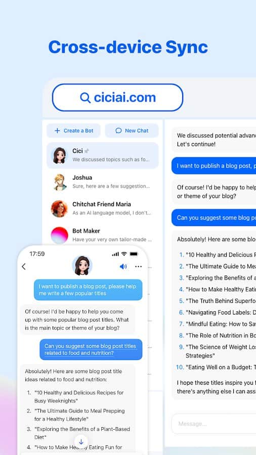 Cici es tu asistente personal basado en inteligencia artificial, que ofrece un bot altamente inteligente para la conveniencia y eficiencia en tu vida. Esta aplicación única está diseñada para usuarios que desean tener un asistente confiable e inteligente capaz de ayudar en diversas situaciones. El bot ofrece una amplia gama de posibilidades que están limitadas solo por tus necesidades e imaginación. Puedes usar Cici para estudiar, para obtener ayuda con la resolución de problemas, preparación de exámenes, o simplemente para expandir tu conocimiento. También puede ser útil para satisfacer tu curiosidad proporcionando información sobre diversos temas y respondiendo a tus preguntas. Gracias a su adaptabilidad, Cici es capaz de adaptar su estilo de comunicación a tus características para asegurar una interacción cómoda y natural.