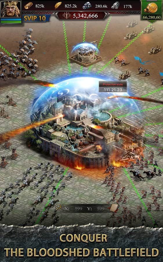 Clash of Kings - una gran estrategia militar para desarrollar en tus smartphones y tabletas Android. Tienes que controlar el Imperio de los siete reinos. Tu tarea no solo es desarrollar tu Imperio, sino también defenderte de los enemigos y no permitir que capturen tu Reino. También en línea puedes pelear con otros jugadores por el título de gobernante más exitoso. Además, no te olvides de la política interna y de la población del Reino: mejora los edificios y equipa el castillo.
