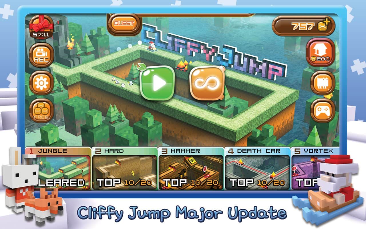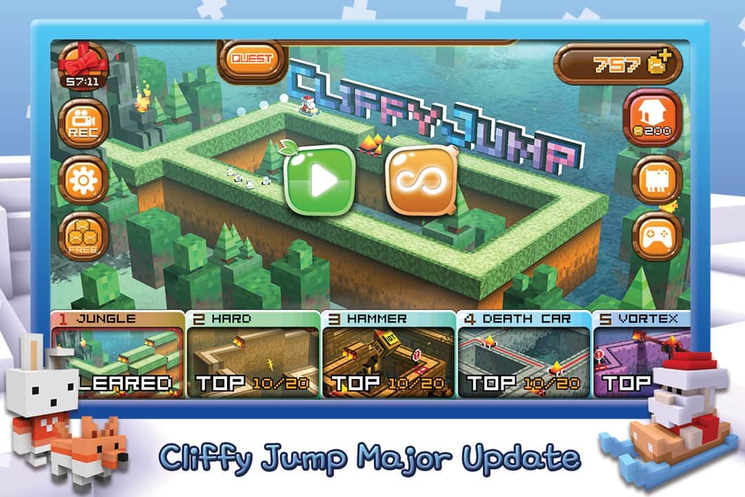El estudio desarrollador WeGo es ampliamente conocido entre los propietarios de dispositivos móviles gracias a su serie de carreras arcade llamada RE-VOLT. Pero este no es el único proyecto de estos desarrolladores, WeGo ha probado con bastante éxito en la creación de estrategias en línea y diversas arcadas. Y aquí tenemos un nuevo juego arcade con una jugabilidad inusual y gráficos pixelados - cúbicos. Cliffy Jump es algo intermedio entre un runner, un plataformas, un rompecabezas y una aventura narrativa, así que todo es un poco complicado. El proceso de juego, a primera vista, es bastante simple; tu personaje se desplaza por un nivel generado aleatoriamente lleno de trampas, y tu tarea es saltar sobre varios obstáculos mediante toques. Pero en realidad, todo es mucho más complicado; cada ubicación oculta una serie de escondites, y al completar el nivel recibirás un ascenso de rango, lo que a su vez complicará los niveles, y tendrás a tu disposición más de 60 divertidos héroes y la posibilidad de compartir tus logros con amigos.