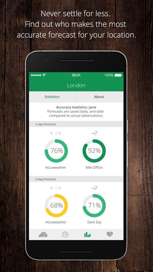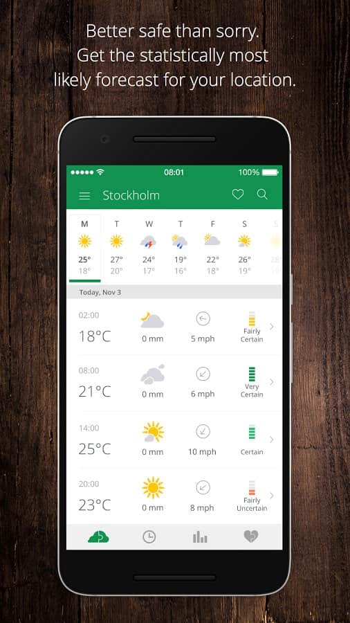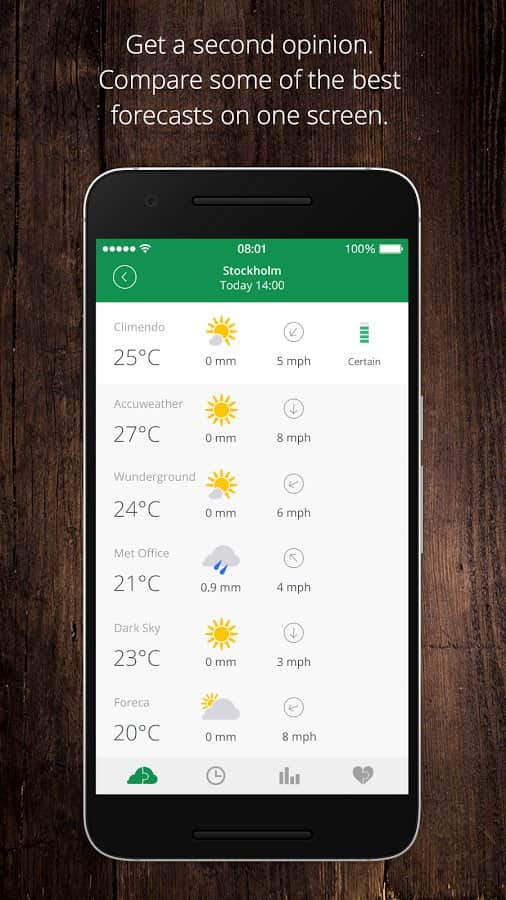Climendo es una aplicación muy única que recopila pronósticos del tiempo de varios recursos en Internet, y al incitar estos valores muestra el pronóstico más preciso que puede haber. Además, cuenta con una interfaz muy simple y conveniente, lo que significa que ya no tendrás que preocuparte por encontrar los valores correctos, serán seleccionados de la mejor manera y podrás acceder a ellos. El pronóstico se actualiza con mucha frecuencia, por lo que siempre estarás informado.