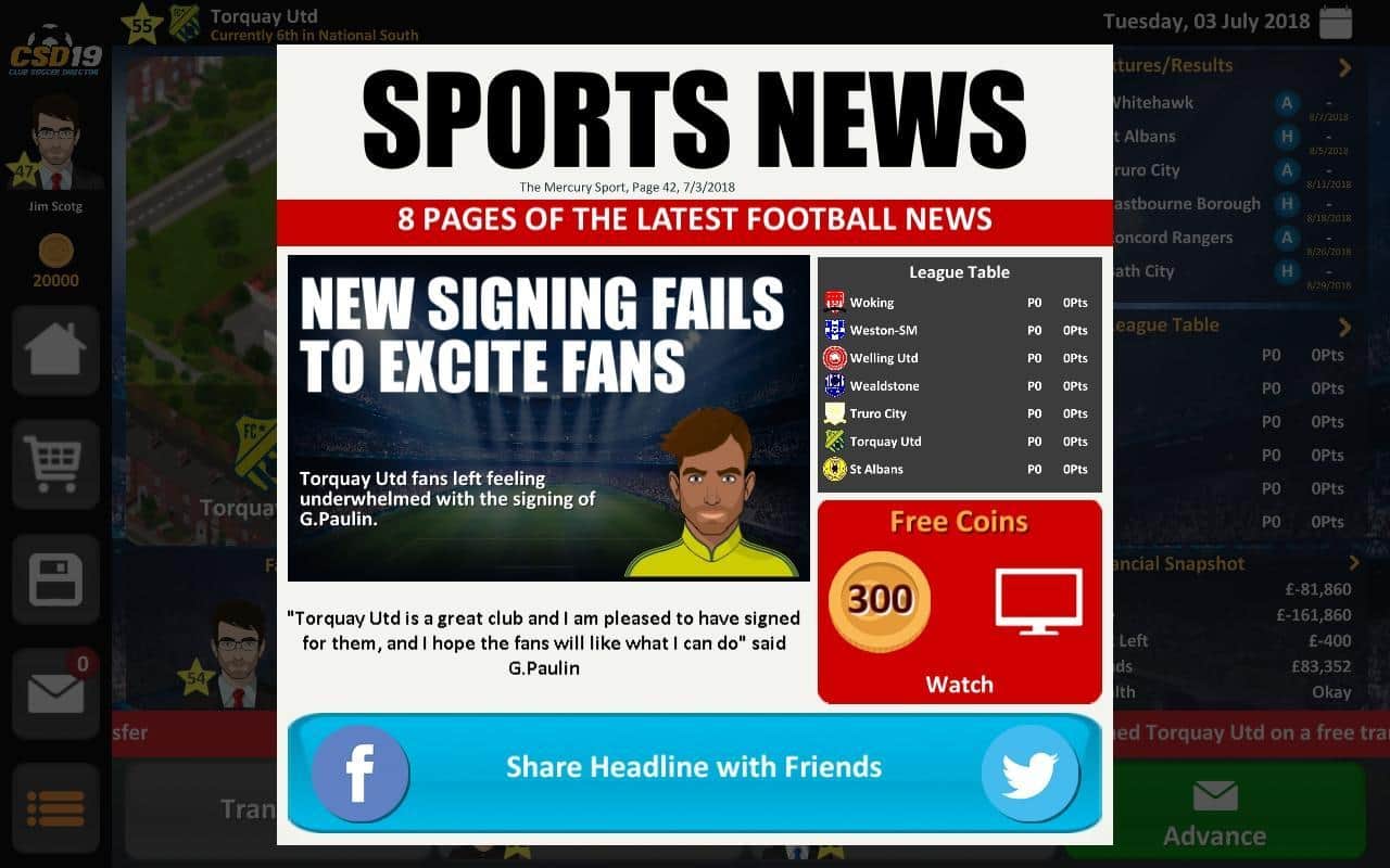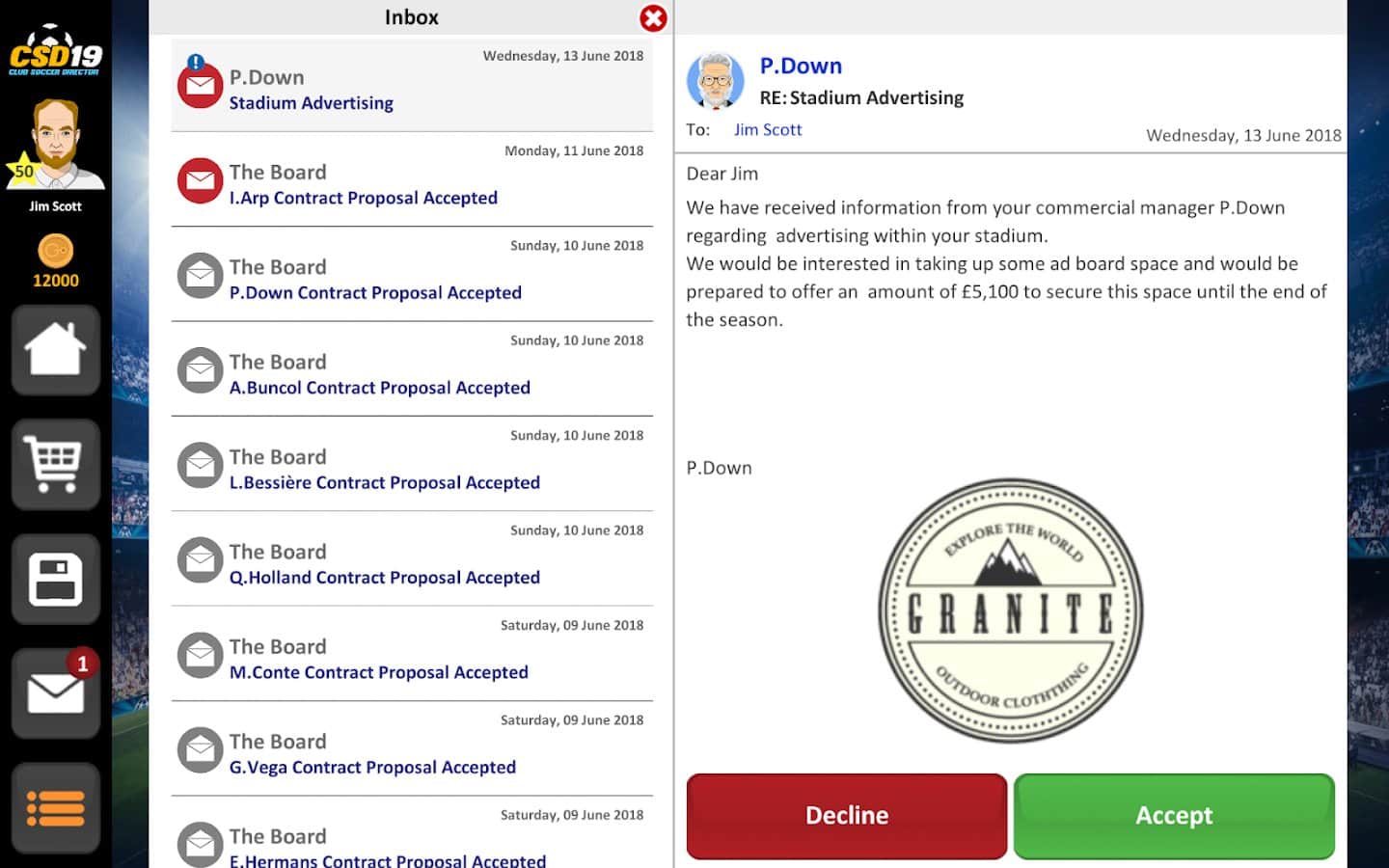Club Soccer Director 2019 - Gestión de Clubes de Fútbol – gestor de fútbol popular en Android, con nuevas innovaciones. En este juego, jugarás el papel de un director deportivo que debe gestionar un club existente o crear el tuyo propio. Este juego ha añadido nuevos países como: Portugal, Países Bajos, Turquía, Rusia, Escocia, Argentina, EE. UU., Brasil y México. Elige una de las ligas disponibles y comienza la ascensión a la liga más alta. Contrata y despide personal, mejora estadios y otros edificios, encuentra patrocinadores y aumenta los ingresos, lo que complacera a la Junta Directiva.