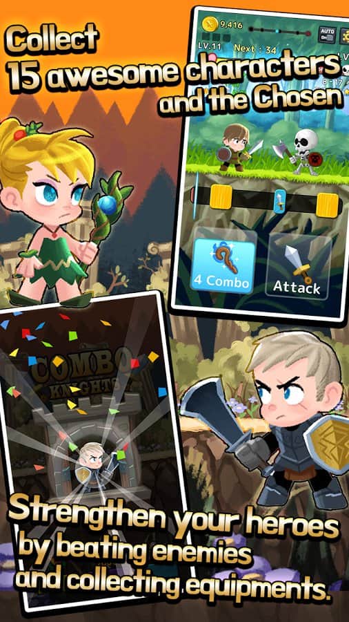 Combo quest - Embárcate en una emocionante aventura alrededor del mundo, tú eres el héroe que debe destruir a los enemigos en tu camino. Tu tarea es muy simple, presiona mientras estás en la pantalla corriendo alrededor de la franja pintada debajo de los bloques. Si no tienes tiempo, los enemigos te atacarán. Además, durante el juego desbloquearás nuevos personajes, y ellos a su vez tendrán habilidades y armas propias. Con el paso de cada monstruo, elegirás una de las características para mejorar. El juego se vuelve muy complicado, pero interesante.