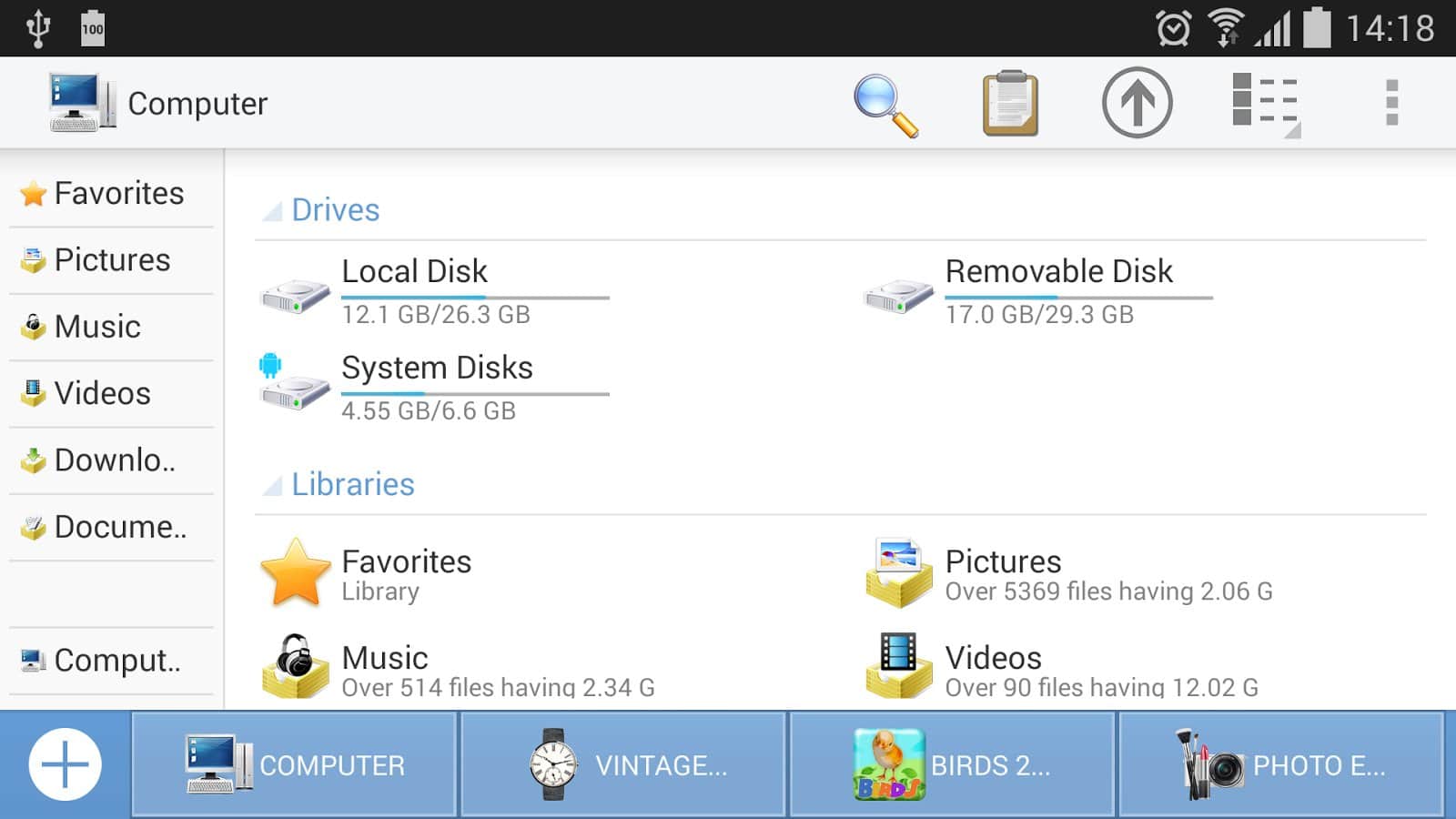 Computadora es casi una copia idéntica del Explorador “mi computadora» Windows XP. Podrás ver las carpetas estándar como iconos grandes, iconos pequeños y tablas (configurado a tu gusto). Puedes ver y abrir archivos sin salir del Administrador. Para simplificar y facilitar la copia y el movimiento de archivos, la aplicación tiene el botón "seleccionar todo" y "selección" usando el multi-táctil (al hacer clic en la carpeta no se abrirá, y se mantendrá). Además, tienes acceso a archivos comprimidos, así como a un visor de imágenes incorporado que soporta muchos formatos populares. Y, por supuesto, el programa tiene una interfaz intuitiva y agradable que realza su atractivo.