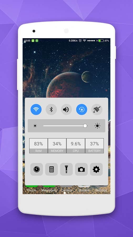 Panel de control - Centro de control - ¿Siempre has querido un panel de control como en iOS 10? Ahora tu sueño puede hacerse realidad con la ayuda de esta aplicación, puedes crear tu propio panel de control al estilo de iOS 10, todo lo que necesitas es ir a la configuración y cambiar todo por tu cuenta. En la aplicación encontrarás muchas funciones estándar así como una barra con música. Administrar este panel también es fácil, estará ubicado en la parte inferior de la pantalla y se puede desplegar con un solo deslizamiento hacia arriba.