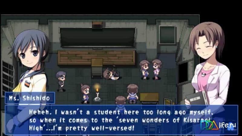 Corpse Party: Blood Covered-Repeated Fear – un juego para PSP donde desvelarás el misterio de las escuelas elementales Tenjin. En este juego hay muchos héroes, elige uno de los personajes como: Mochida Satoshi, Mochida Yuka, Shinozaki Ayumi, Naomi Nakashima, Shinohara Seiko, Kaminuma Amici, Morishige de Sakutaro, el Schischido Yu y comienza a jugar. En este juego tu tarea principal será reunir a todos los personajes del juego, interactuar con varios objetos, comunicarte con los jugadores y leer diversos documentos. En el juego, cada uno de los personajes puede ser atacado por espíritus peligrosos de los cuales solo podrás escapar. Los eventos en este juego se desarrollarán con una velocidad sin precedentes y dependen directamente de las acciones de los jugadores. Piensa cada paso y toma decisiones apropiadas.