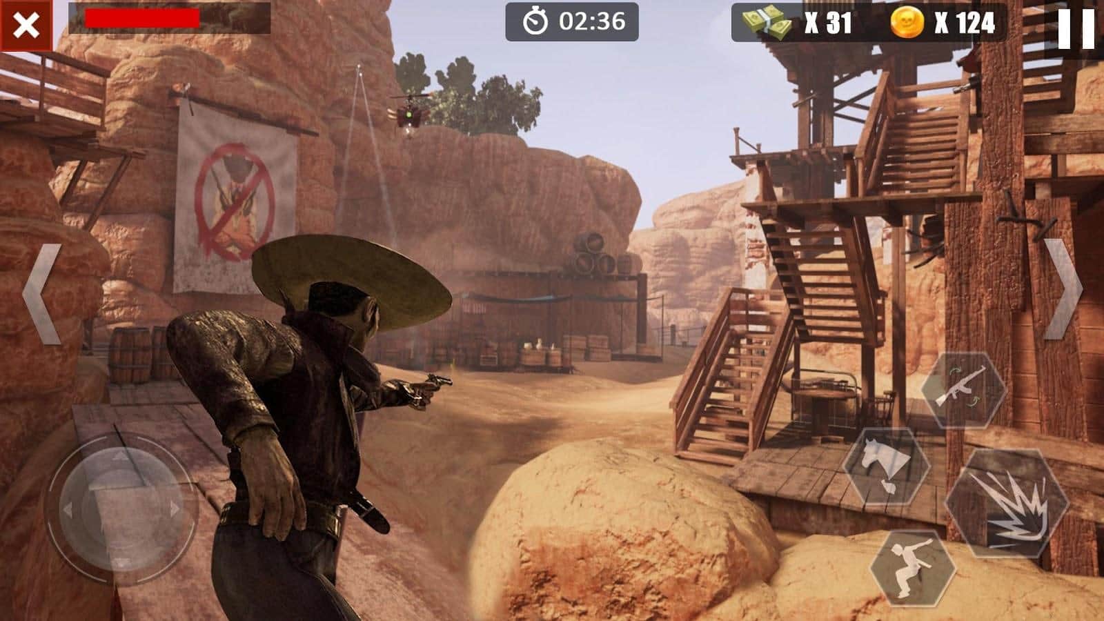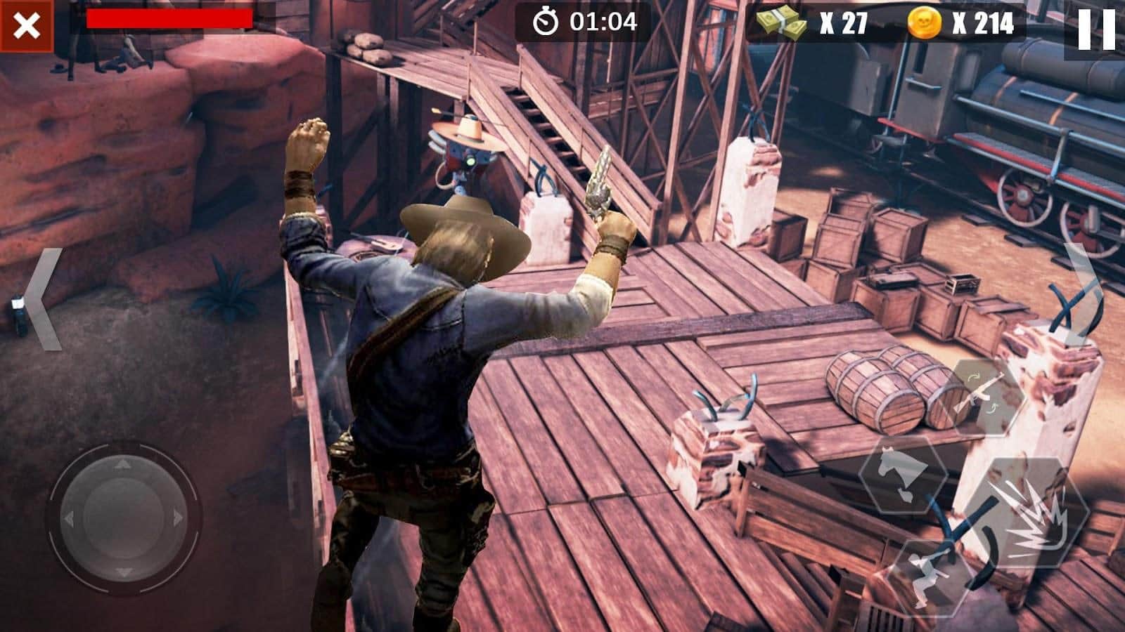 Aventura de Vaqueros – un juego de aventura para Android donde controlas a un vaquero en el Viejo Oeste. Estos lugares son praderas americanas habitadas por algunos gánsteres, bandidos y cazadores de recompensas, incluso el Sheriff puede venderte por una pequeña cantidad de dinero. Toma el control de un vaquero y viaja a las minas de oro del Klondike y el Yukón. Completa misiones y tareas peligrosas del juego y obtén recompensas y bonificaciones. Prueba tus habilidades en el papel de un cazador de recompensas y demuestra tu destreza con las armas. Participa en tiroteos con bandas de la mafia y sobrevive en el peligroso entorno del mundo occidental.