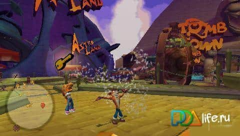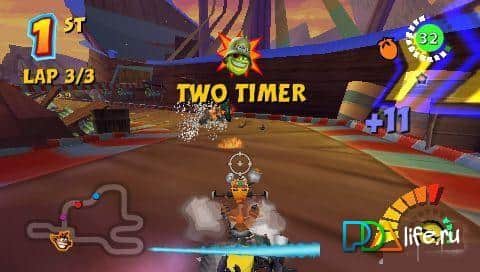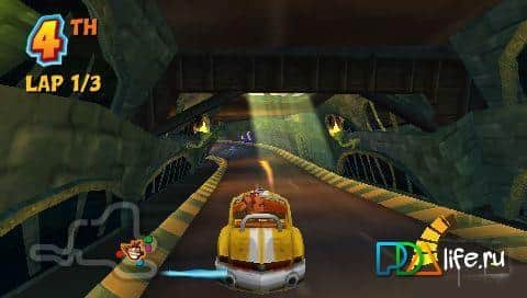 Crash Tag Team Racing - carreras para la PSP - un héroe incansable - Fox Crash vuelve a meterse en problemas. ¡Para sobrevivir en una carrera aparentemente inofensiva, tendrás que hacer un gran esfuerzo! No hay reglas, cada coche tiene sus propios cañones cargados y ametralladoras y están listos para pelear con cualquiera que se interponga en su camino. Y si la velocidad no es lo tuyo, el arma siempre es útil, especialmente para adelantar a los rivales. Bueno, si, de repente, tienes los pies adormecidos, ¡no hay problema, siempre puedes salir del coche e ir a pie! Esto ayudará a conseguir nuevas piezas, encontrar la pista oculta y destruir un par de edificios - ¡y de repente hay algo interesante!