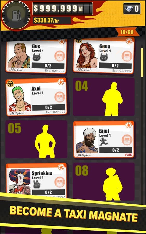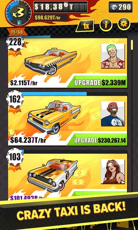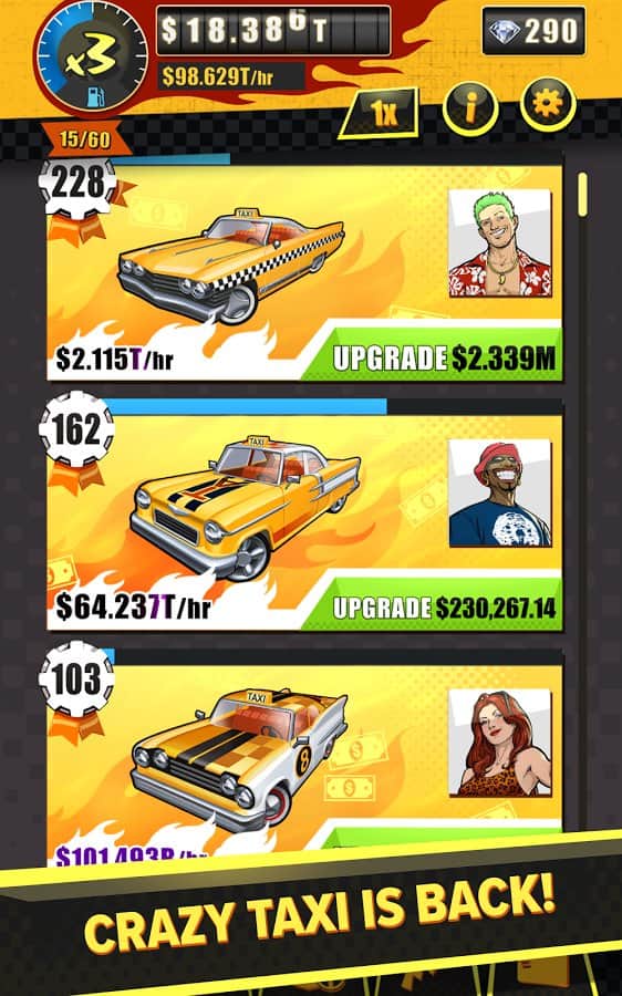 Quizás muchos propietarios de dispositivos móviles recuerden la exitosa serie de carreras de SEGA donde juegas el papel de un taxista loco en el juego llamado Crazy Taxi. Y así, el estudio SEGA decidió hacernos una secuela, pero esta vez los desarrolladores han centrado su atención en un género completamente diferente, a saber, el gestor de tiempo. Crazy Taxi Gazillionaire - un juego en el que te convertirás en el propietario de una flota de taxis, y tratarás de convertir tu empresa en la más solicitada de la ciudad. Sin embargo, vale la pena recordar que la memoria de los viejos tiempos contrató a conductores tan locos como lo fue en el pasado, lo que sin duda influyó en el estilo de hacer negocios. Y todo lo demás está en tus manos, gestiona tu empresa, contrata conductores, compra coches y demuestra a todos de qué eres capaz.