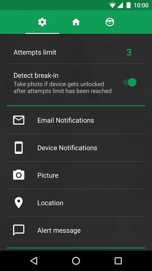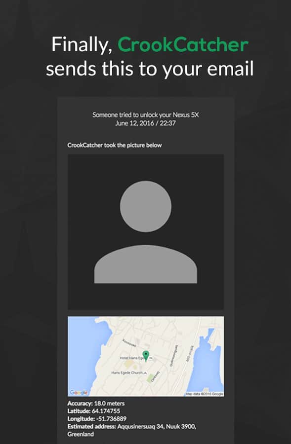 CrookCatcher - Anti Theft – una buena aplicación del desarrollador Jakob S. Harteg, cuyo objetivo es informar al propietario del teléfono en caso de un intento fallido de desbloquear la pantalla del dispositivo. Se enviarán automáticamente a su correo electrónico fotos del delincuente y las coordenadas GPS de la ubicación del gadget. La única PEGA es la existencia de una cámara frontal en el dispositivo.