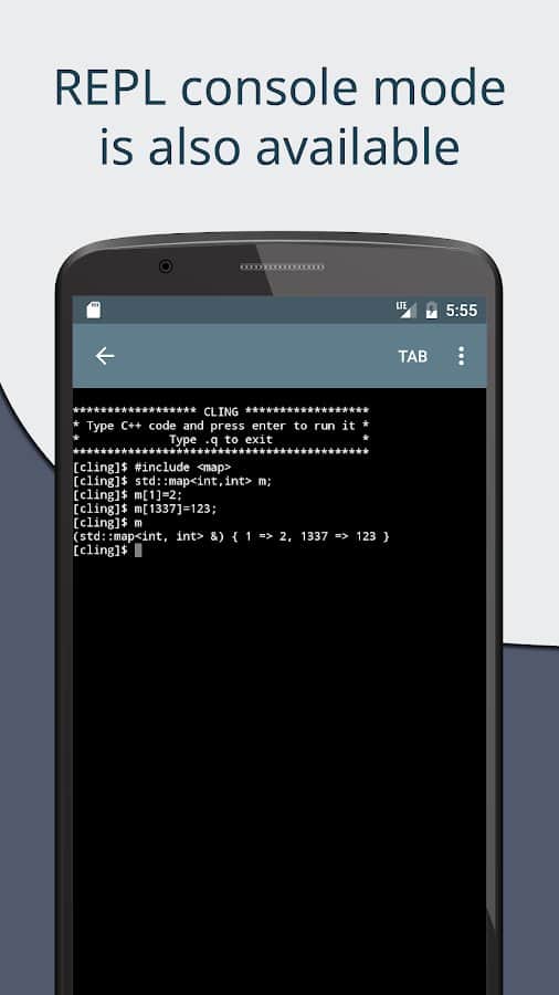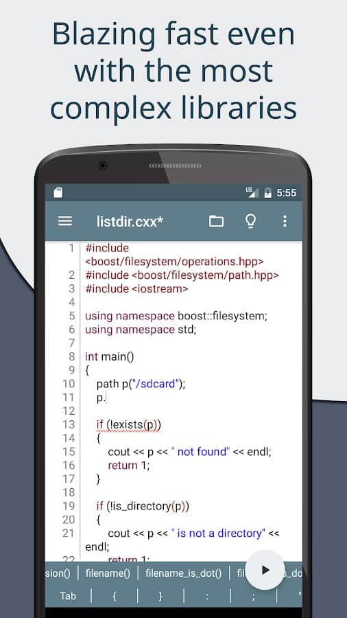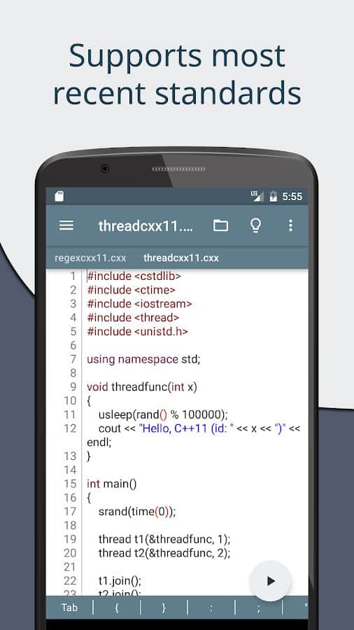 Cxxdroid - IDE de compilador C/C++ - Aprende de forma fácil y rápida las habilidades para utilizar el lenguaje C y C++ en tu dispositivo móvil. Dentro de la aplicación, ya tendrás todo lo que necesitas para trabajar: Boost, SQLite, ncurses, libcurl, SDL2, SFML, Allegro, etc. Las funciones disponibles en tiempo real pueden ser útiles más de una vez en tu trabajo, ya que es posible predecir automáticamente la indentación y realizar análisis detallados del código, como en un IDE real. La característica principal es que tendrás acceso a un gran panel de teclado con los símbolos necesarios para programar en C++.