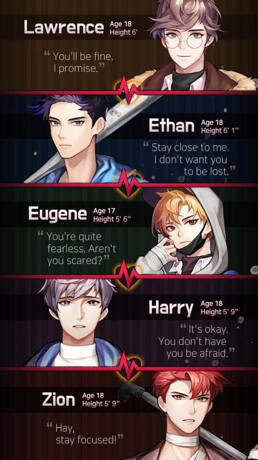 Peligroso: Otome-Thriller - cuando el mundo fue golpeado por un desastre con los ataques de zombis, los pensamientos de todos eran solo de salvación. Salvaste a 5 chicos, pero no conocías a nadie. La historia tendrá un nuevo color, a pesar de la terrible historia en muchas ciudades. Lawrence, Ethan, Yuji, Harry y Zion son completamente diferentes, pero eso atrae a todos aún más. Revive todas las emociones ocultas en la escuela, toma decisiones difíciles y observa la reacción, escucha sonidos realistas, cámbiate a la ropa disponible y observa cómo han cambiado los tiempos.