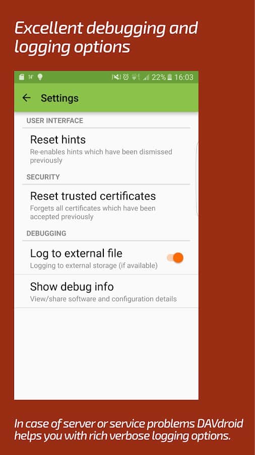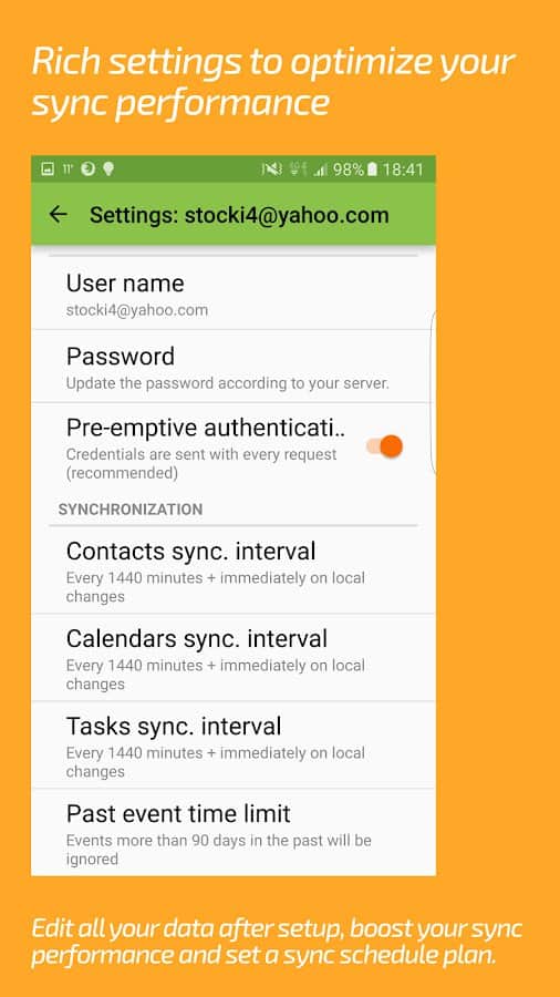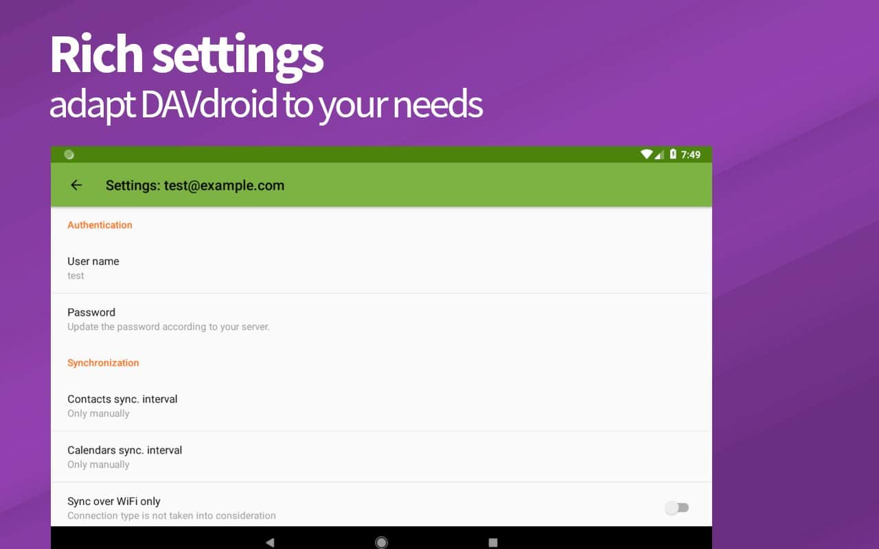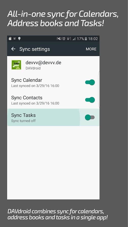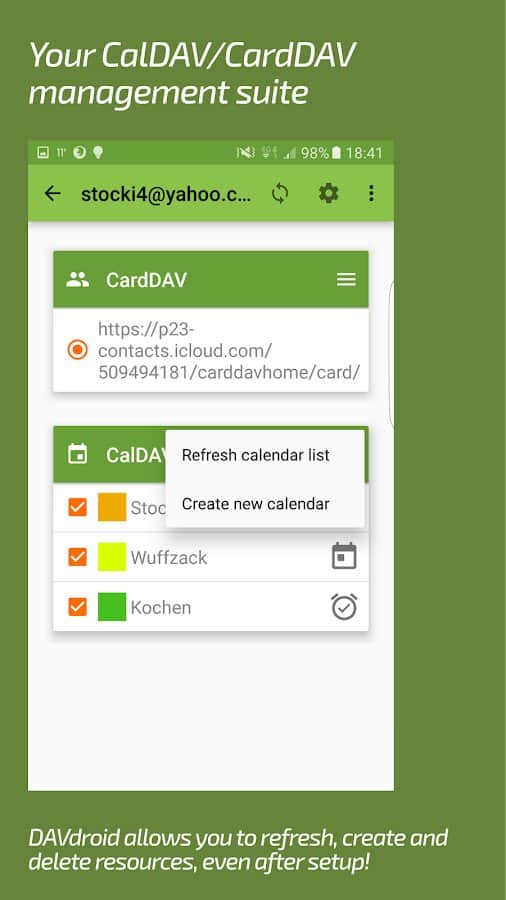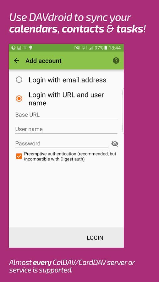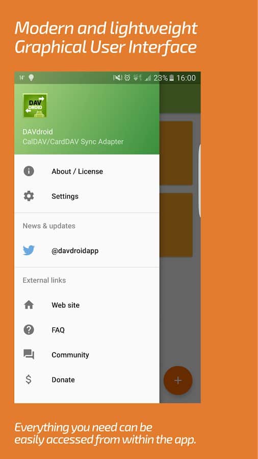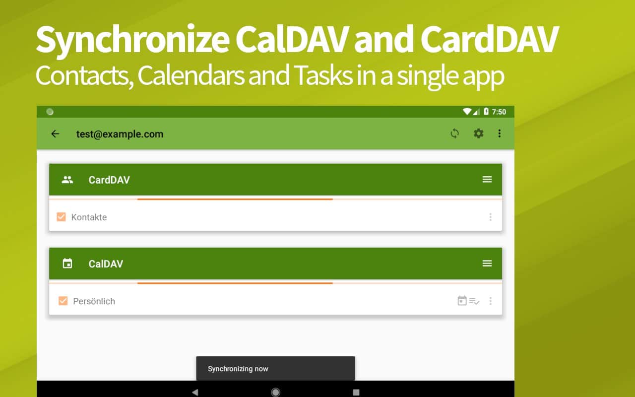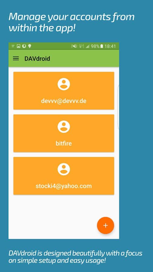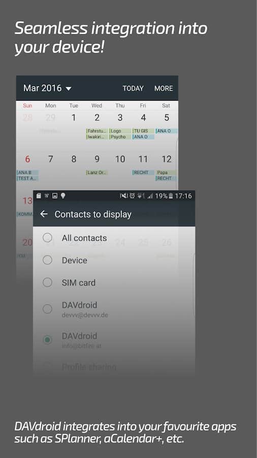 DAVx⁵ (DAVdroid) – Sincronización CalDAV/CardDAV - aplicación conveniente, funcional y simple que te permitirá sincronizar no solo contactos y calendarios, sino que los programas mismos son responsables de los calendarios, la programación de tareas y mucho más. Cabe destacar que el proyecto funciona sin conexión a la red y la mayoría de los servicios y recursos en línea. La sincronización con otras aplicaciones de terceros no causó la misma dificultad.