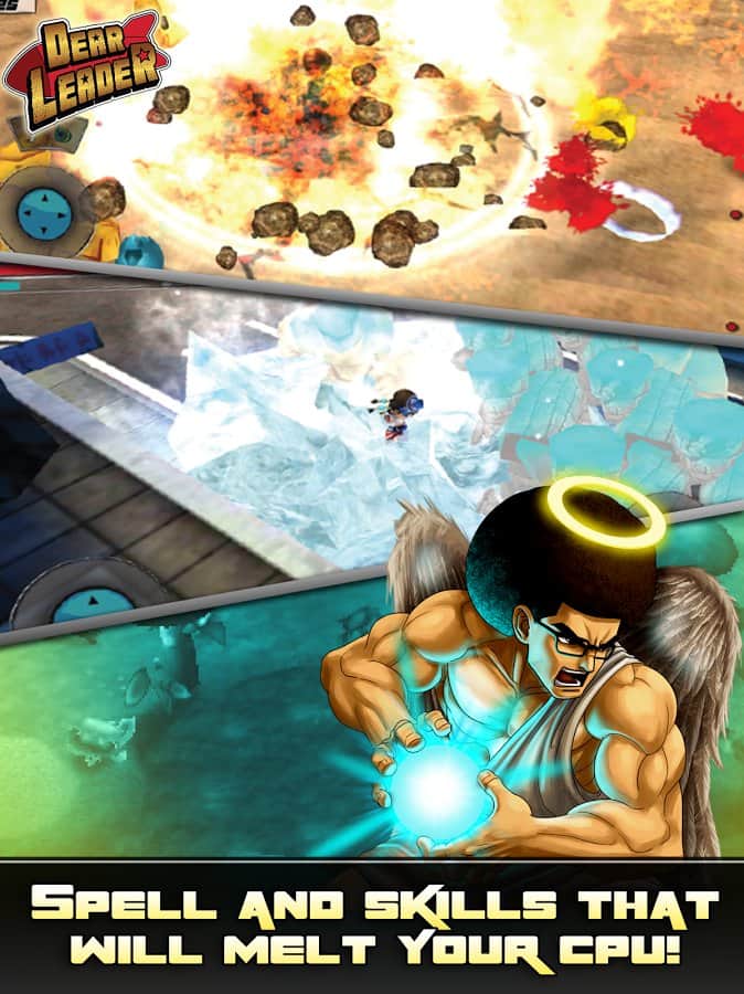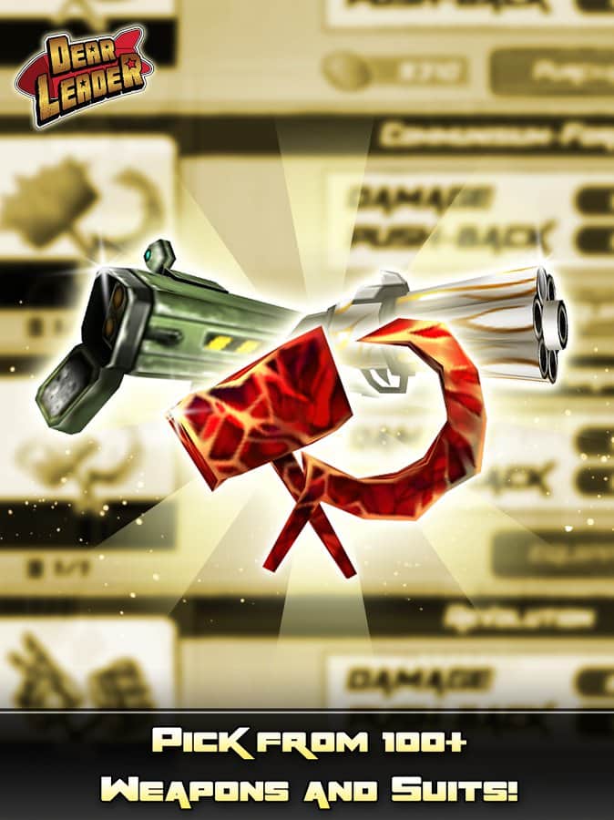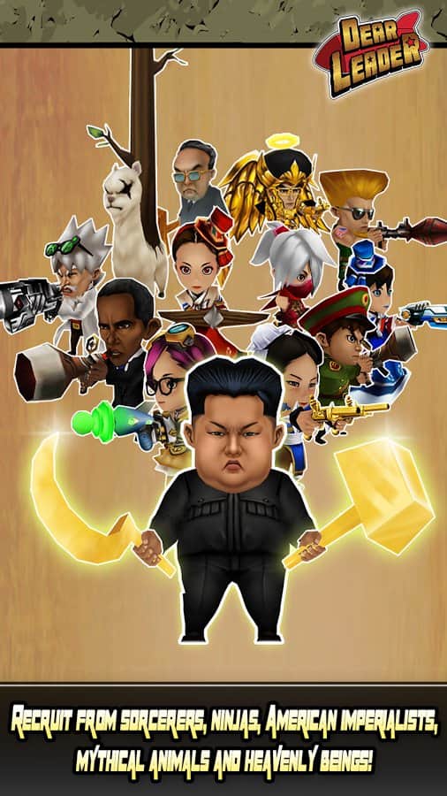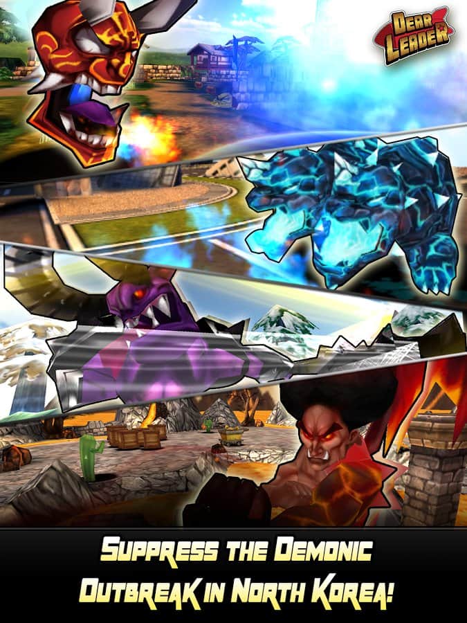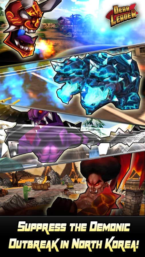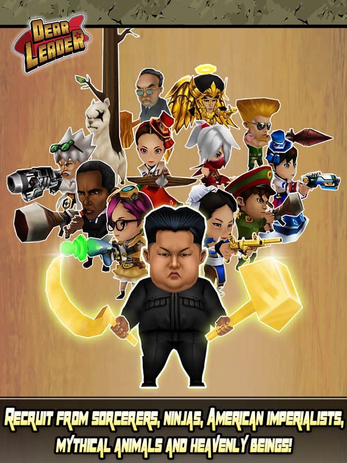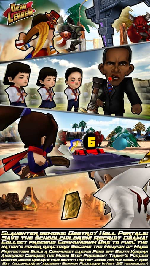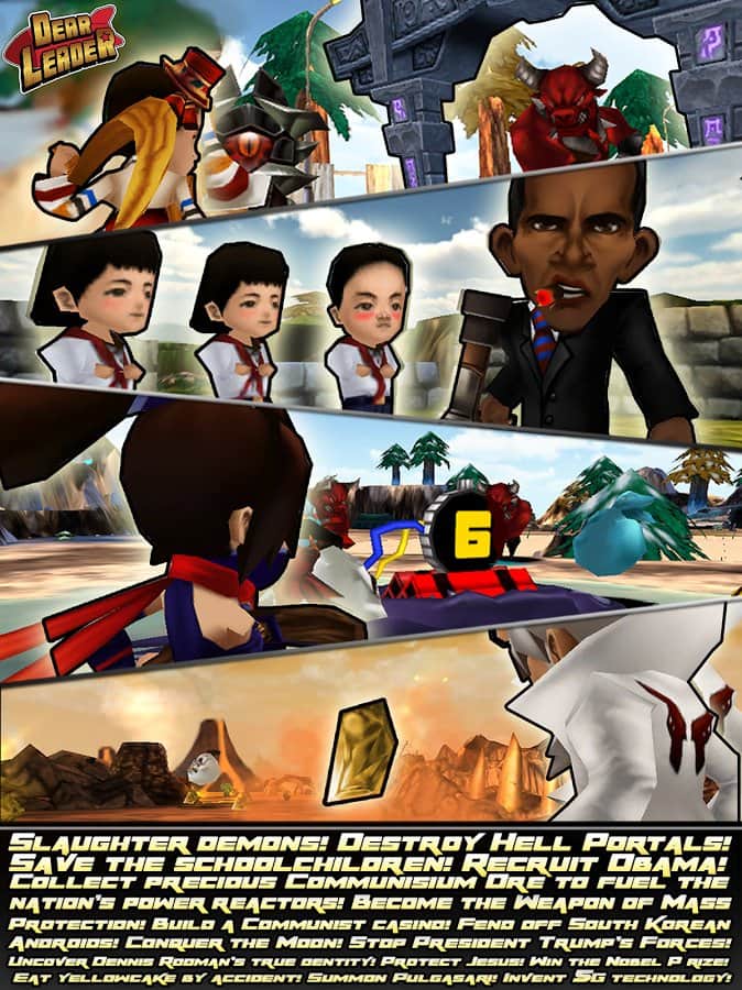 Querido Líder – un juego en Android donde ayudarás al líder norcoreano a derrotar a los demonios. En este juego controlarás a Kim Jong Il y a su sucesor Kim Jong-UN, quienes necesitan proteger su país y el mundo de la amenaza de invasión de los demonios. Armado con una hoz y un martillo, nuestro héroe se enfrenta en batalla a hordas de enemigos y los destruye uno por uno. No dejes que los demonios se apoderen del mundo y protege a los civiles de ellos. También en este juego podrás usar armas modernas y más rápidas para destruir a los enemigos. Invoca la ayuda de criaturas míticas, ninjas y otros líderes de Naciones.