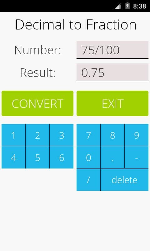 la aplicación "Decimal a fracción Pro" es una herramienta simple y necesaria para estudiantes que convierte decimal a fracción. Programas de pequeño tamaño ahorrarán espacio en la memoria de su dispositivo, no consumirán energía de la batería y ofrecen al usuario funciones simples pero útiles para el cálculo y análisis del algoritmo para resolver el problema. La aplicación está completamente libre de anuncios y su diseño intuitivo le ayudará a entender el convertidor en solo unos segundos.