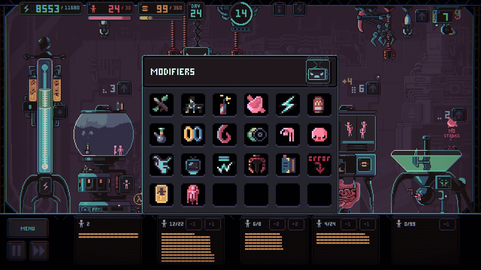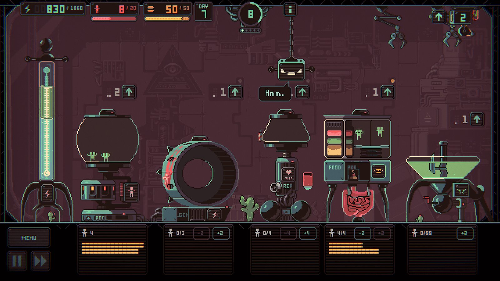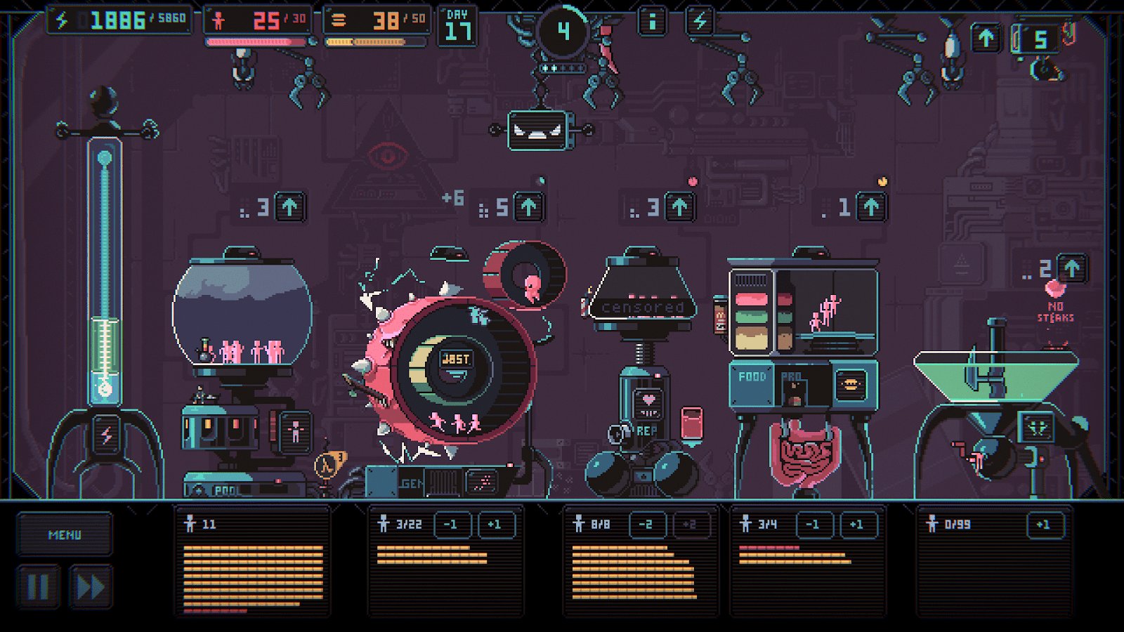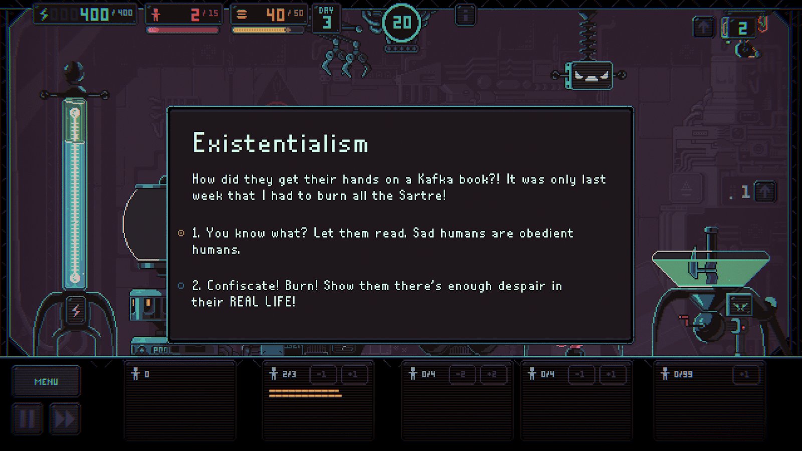 Despotismo 3k – juego de estrategia con elementos de roguelike para Android, donde tienes que esclavizar a la humanidad. En este juego eres transportado a una era donde el mundo es gobernado por IA y manipula a las personas que deberían darle poder. Construye tu vasto imperio y asegúrate de que la gente esté haciendo su trabajo y no muera de hambre y fatiga. Tu tarea principal en el juego es el movimiento de personas entre dos edificios con una garra mecánica. En un edificio, las personas tienen que descansar, multiplicarse y producir su propia comida, y en el otro - producir energía, que escasea. El juego te deleitará con humor negro, numerosas misiones y quest.