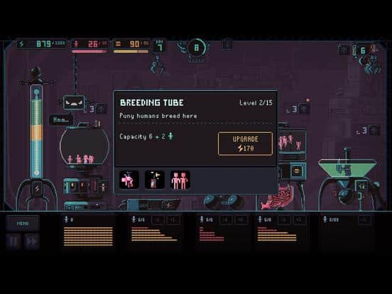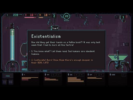 Despotismo 3k – juego de estrategia con elementos de roguelike para IOS, donde esclavizarás a la humanidad. En este juego eres transportado a una era donde el mundo es gobernado por inteligencia artificial y manipulando a la gente pequeña que tiene que conseguir el poder. Construye un enorme imperio y ten cuidado con la gente haciendo su trabajo y no mueriendo de hambre y fatiga. Tu tarea principal en el juego será mover a las personas entre dos edificios con una garra mecánica. En un edificio las personas tienen que relajarse, multiplicarse para conseguir su propia comida, y en otro trabajar, extrayendo energía, que escasea. El juego te deleitará con su humor negro, numerosas misiones y quests.