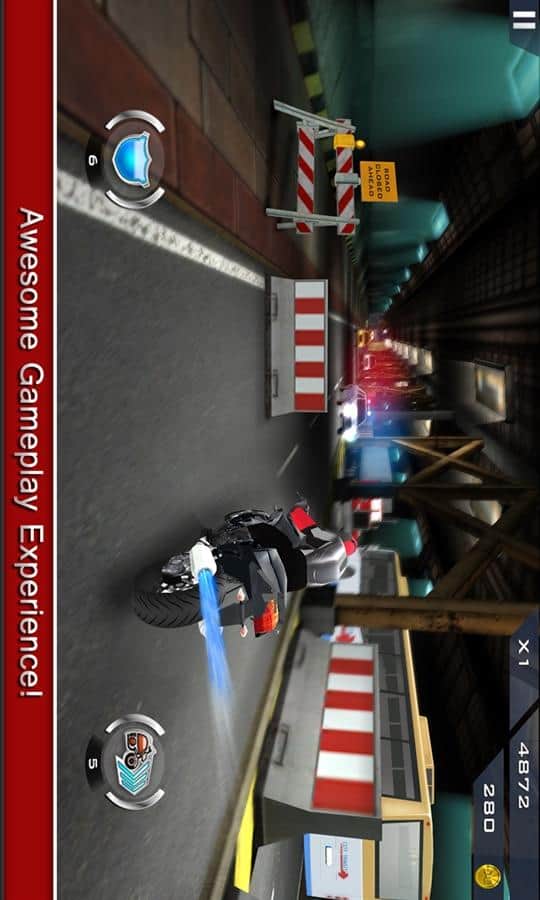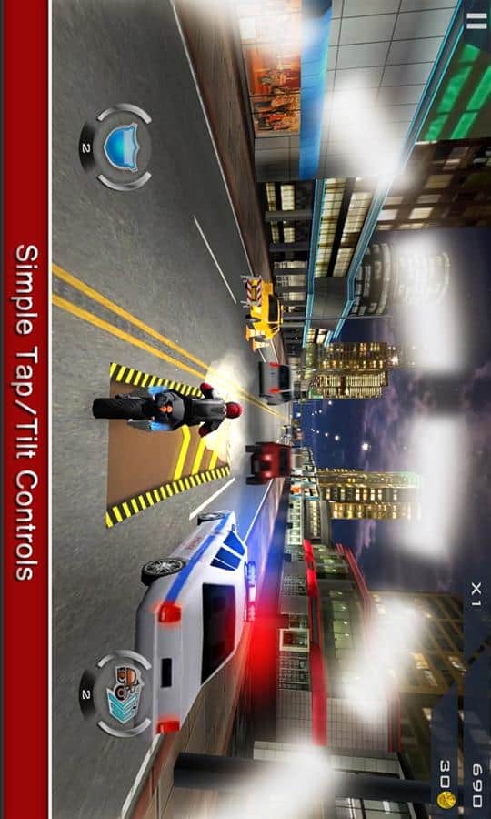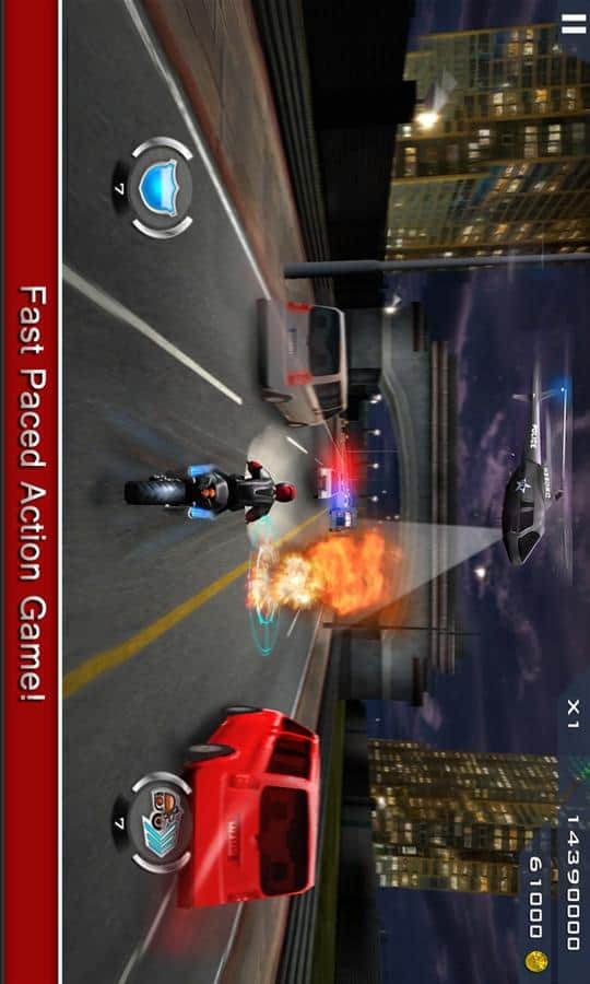 Dhoom:3 The Game - un corredor inusual para Windows Phone. ¡Bienvenido a las calles de Chicago, la ciudad de los gánsteres! Una banda de motociclistas robó exitosamente un banco y ahora se escapa de la persecución policial. Tú juegas como el líder de la banda y tus acciones determinan si te atraparán o no. La tarea principal es, precisamente, huir, pero se trata de una carretera concurrida con un denso flujo de tráfico, así que las dificultades son evidentes. Además, podrás ganar un poco de dinero escapando de la persecución y comprarte una nueva moto o útiles bonificaciones, desde armas hasta escudos y nitro.