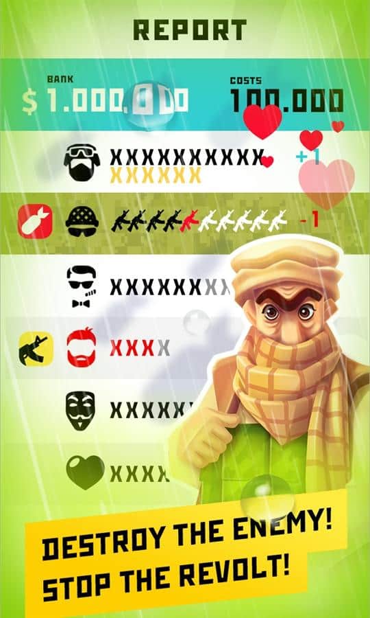Dictador: Revuelta – una estrategia fascinante, donde liderarás una pequeña república y la harás próspera. En este juego tendrás oportunidades ilimitadas para la solución oportuna de diversos problemas y amenazas. Elimina a tus enemigos, hazte amigo de personas influyentes y funcionarios, así como elimina y corta cualquier conspiración que construyan tus enemigos. Resuelve 1000 asuntos importantes, que se acumularán cada día y encuentra el enfoque para cada una de las facciones que deciden el destino de la república. Prevén revoluciones y guerras y supera a los insaciables oligarcas y fiscales que quieren Ivitsa contigo.