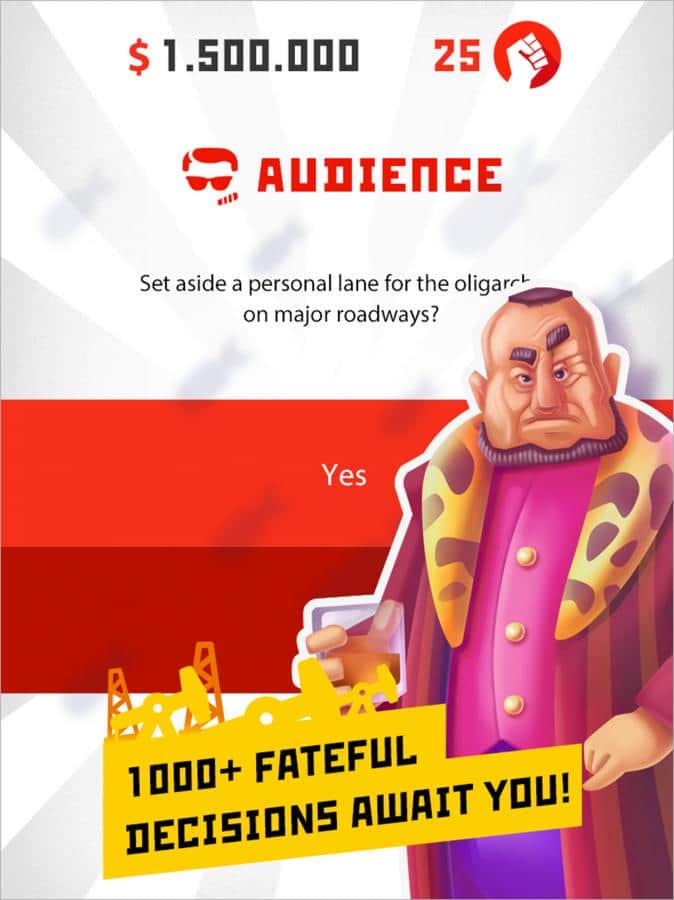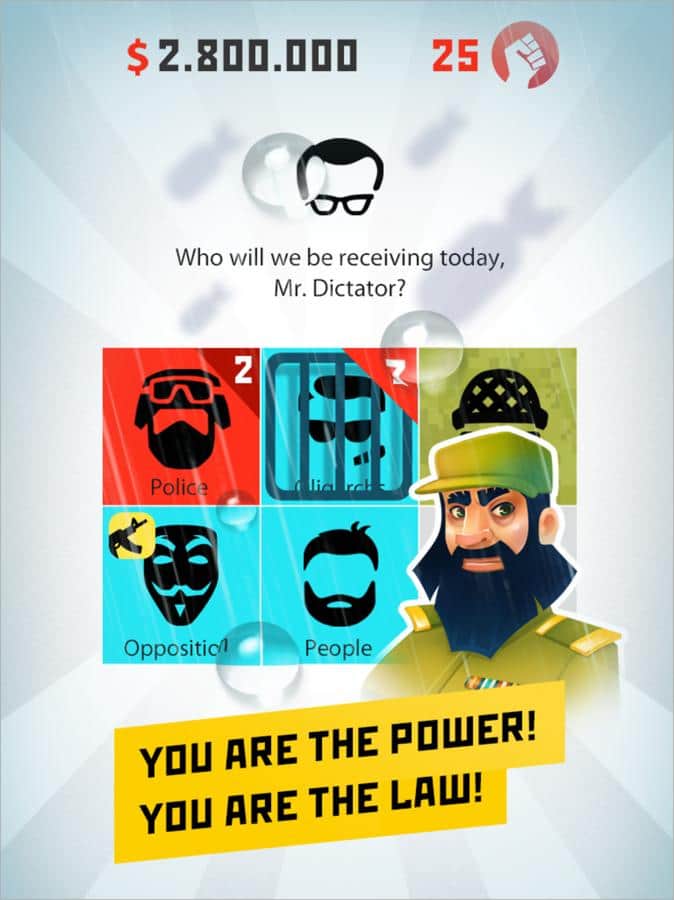 Dictador: revuelta - el juego es considerado una de las mejores estrategias para IOS en países como: Rusia, EE. UU., Alemania, Inglaterra, Australia, Canadá, Francia y otros. Si has soñado durante mucho tiempo con el poder, entonces este juego es especialmente para ti. El resultado se prepara de antemano y tú, en un traicionero golpe de estado, derrocas al gobierno existente y te conviertes en el único gobernante de un pequeño país. ¿Alguna vez has sentido un poder ilimitado? Creo que esa sensación es como cualquier otra para nosotros. En el juego, tus "esclavos" se dividen en seis subespecies: el ejército, la policía, los oligarcas, los defensores de los derechos humanos, el pueblo y tu familia y parientes. El juego es por turnos y en cada turno obtienes uno de los miembros de la facción, por supuesto, tuve que preguntar. ¿Puedes mantener el delicado equilibrio entre la asignación de tu atención a las fracciones?