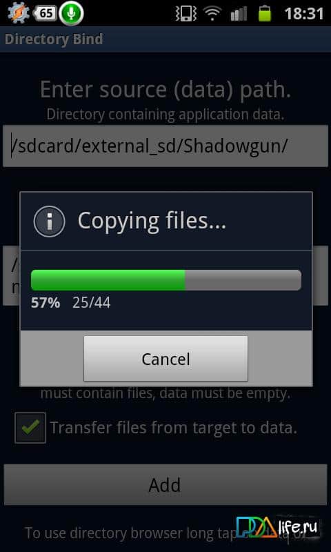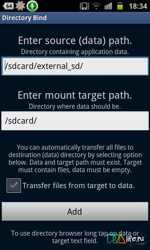 Directory Bind es un programa único para Android, que te permitirá transferir cualquier aplicación a la tarjeta de memoria (microSD), medios USB conectados a través de USB-OTG, de manera simple y comprensible. Todo lo que necesitas saber es la ruta del directorio que contiene los archivos que necesitas (las rutas de las carpetas I/o) y crear un directorio en una unidad flash u otro medio. Solo ten en cuenta que una versión beta estable del programa requiere derechos de Root.