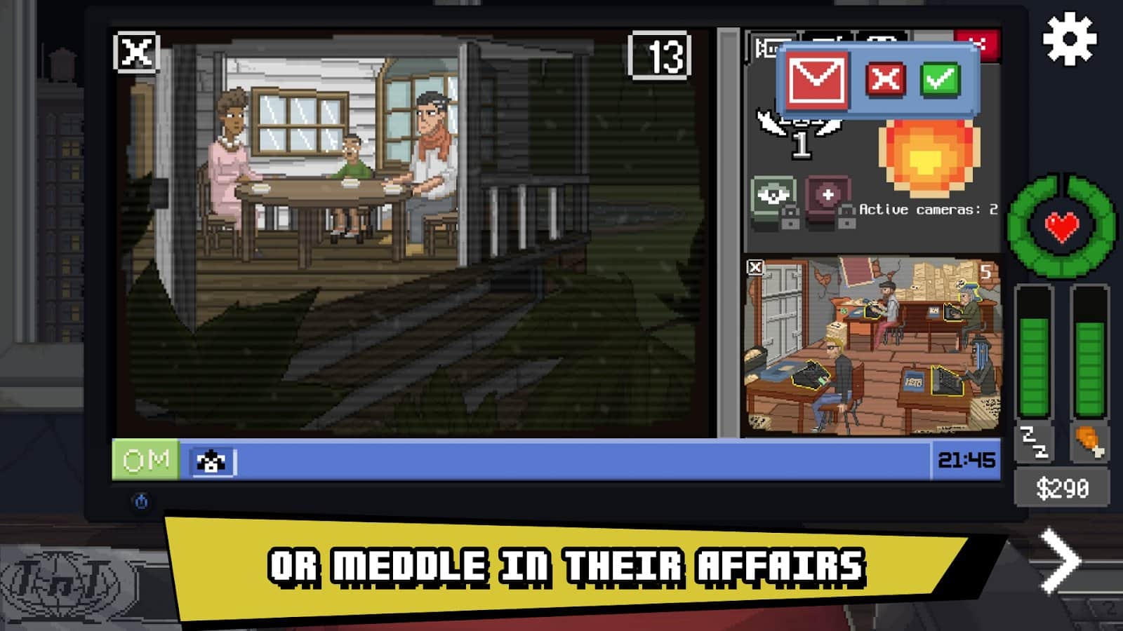 No alimentes a los monos – un juego en Android donde observarás a los monos en su hábitat natural. En este juego actuarás como el oficial de la organización secreta "el Club de Estudio de Primates" y observarás a los monos y su comportamiento natural. Los monos en este juego son las personas a las que debes vigilar todo el día y toda la noche con la ayuda de cámaras de vigilancia ocultas. Estudia los hábitos y las costumbres de los monos, y en ningún caso contactes con ellos, de lo contrario no sabemos lo que podría significar para ti.