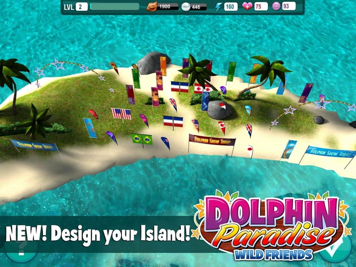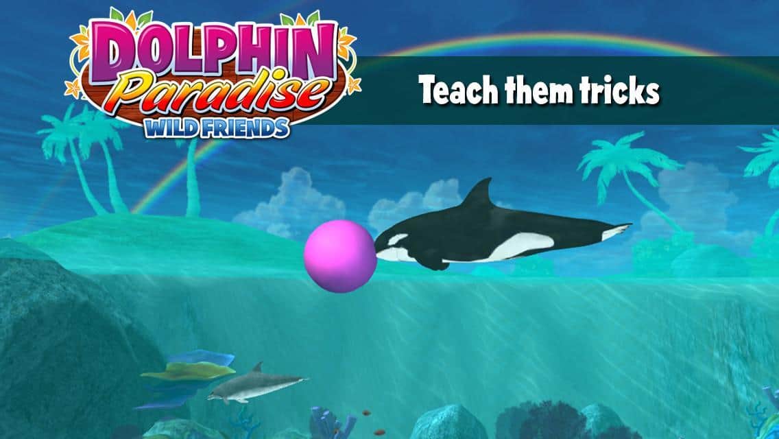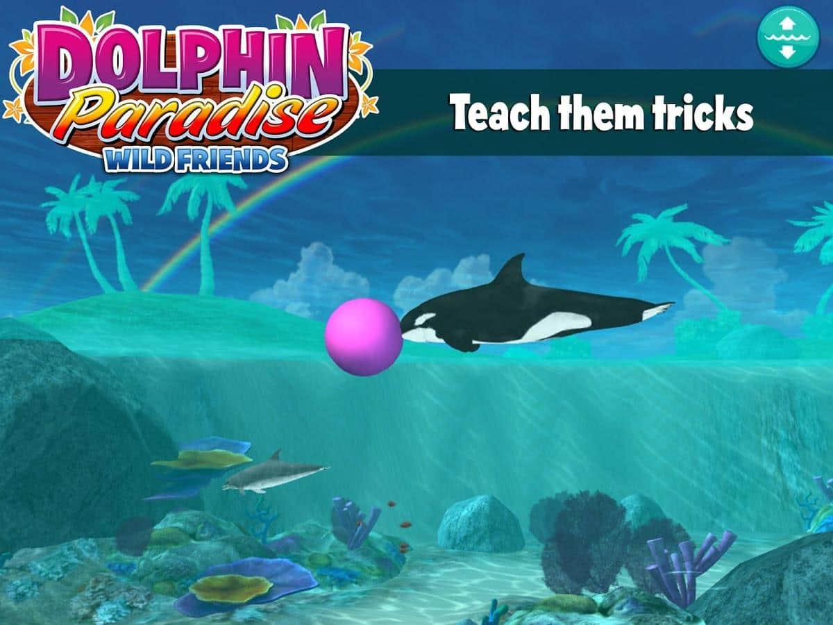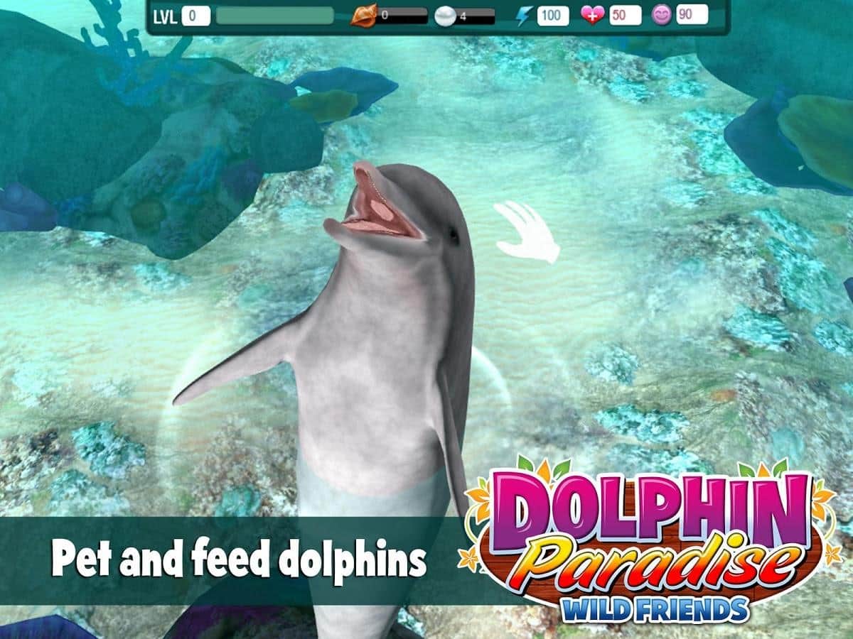 Delfín Paraíso: Amigos Salvajes - un juego en Android en el que debes mostrar todo sobre tu delfín mascota. Tienes que cuidarlo, alimentarlo bien y enseñarle todo tipo de trucos para participar en concursos. Y también limpiar la laguna azul de medusas, en la que vive el delfín, ganando así bonificaciones en forma de conchas y perlas. Las cuales puedes gastar en comprar accesorios para el concurso, golosinas o en la compra de otro delfín.