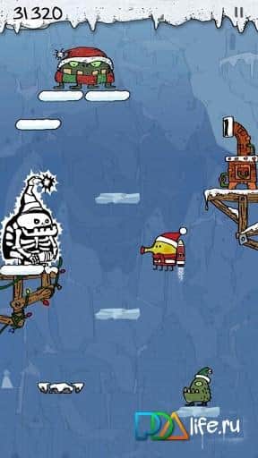 Doodle Jump Christmas Special – juego de arcade navideño del mejor desarrollador GameHouse para Android. Gráficos hermosos, jugabilidad adictiva. Tu objetivo es saltar lo más alto posible utilizando una variedad de herramientas que pueden ser: resortes, mochilas, cohetes y más, que te ayudarán en el camino. No olvides recoger monedas ocultas en cajas, cuanto más grande sea la caja, más monedas tendrá.