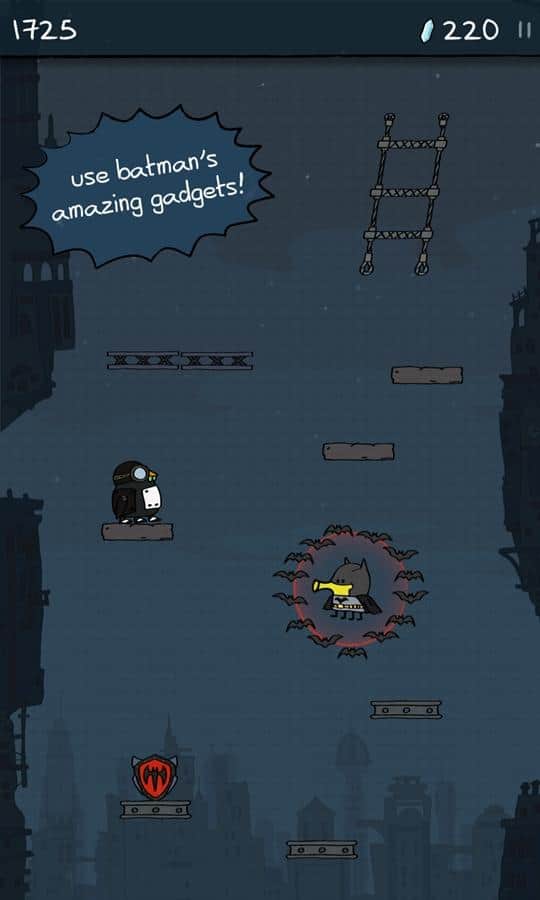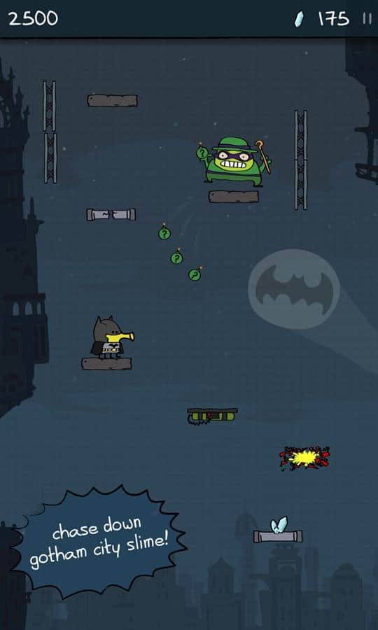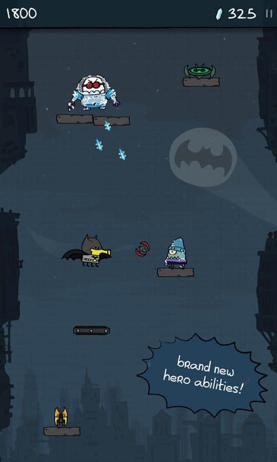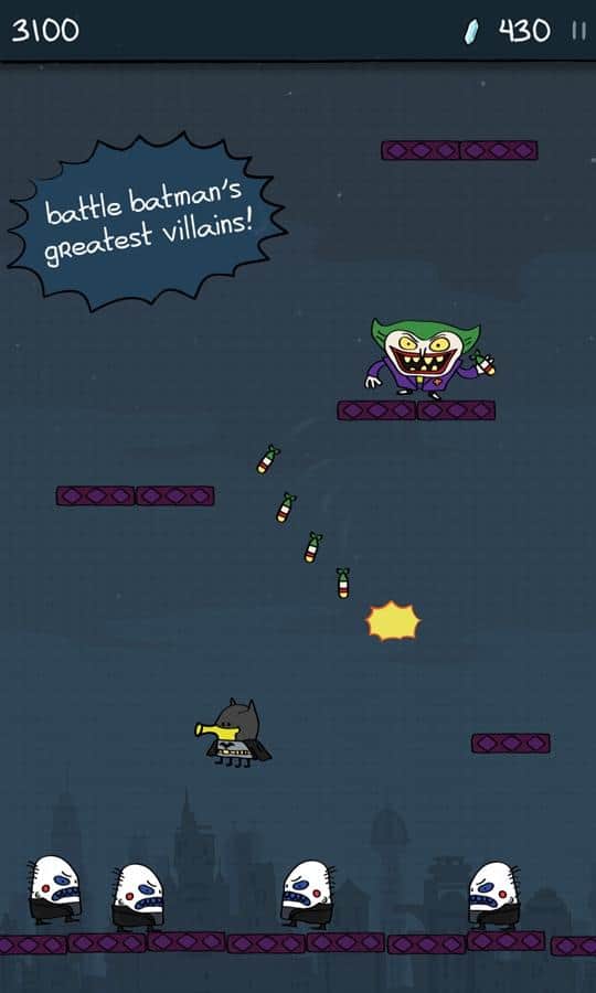 Doodle Jump DC – un juego en el que controlas al superhéroe Batman. Salta más alto en las plataformas y trata de alcanzar a los principales villanos – el Pingüino, Mr. Freeze, el Joker y El Acertijo. Todos los villanos de la ciudad de Gotham están reunidos y han robado el poderoso cristal que podría destruir toda la ciudad. Tu tarea es atraparlos y destruirlos con poderosas armas y equipo. Controla a tu héroe con un clic en la pantalla y recoge monedas y bonificaciones que te ayudarán a enfrentarte rápidamente a los villanos. Desafía a tus enemigos y muéstrales de qué eres capaz.