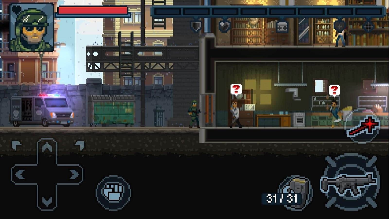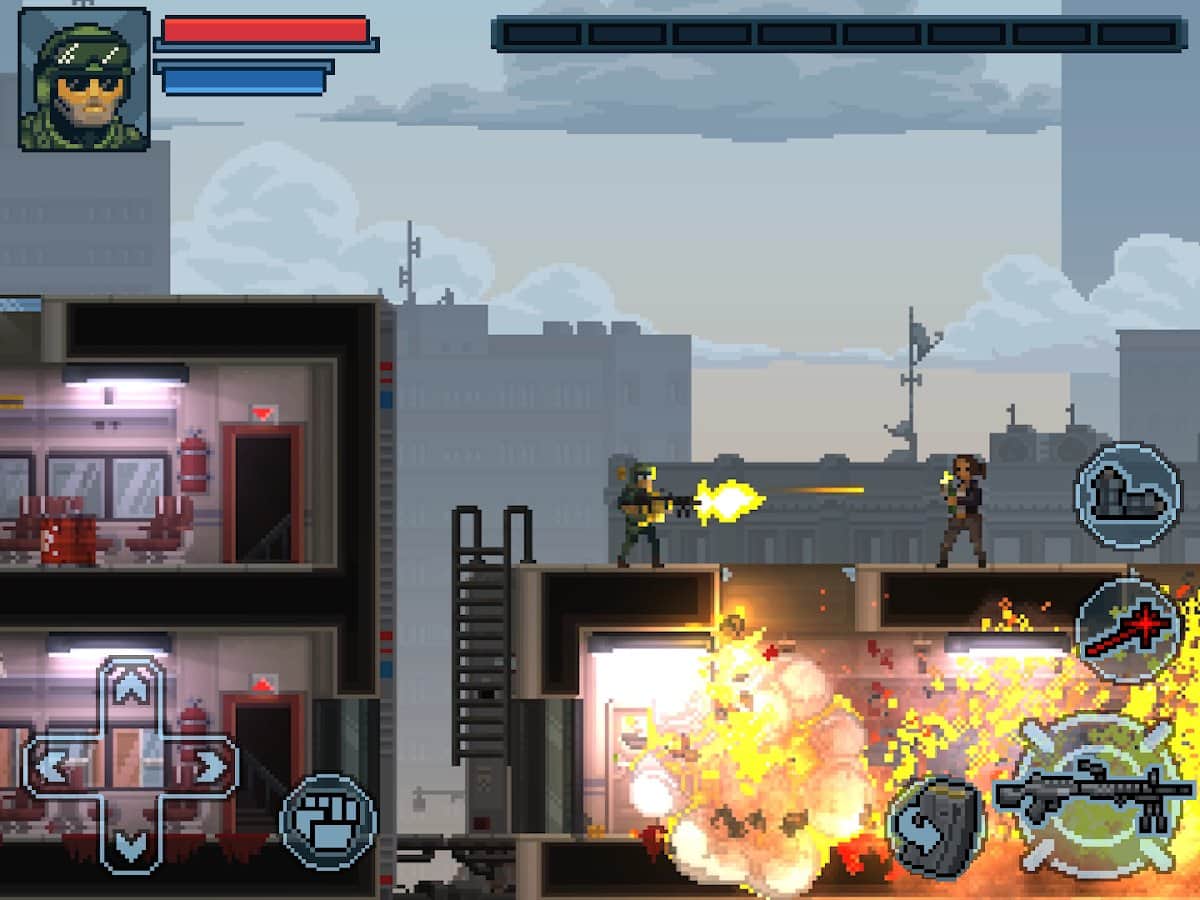 Door Kickers: Action Squad es un loco juego de disparos en desplazamiento al estilo de la vieja escuela, que te pone en el papel de un soldado de fuerzas especiales y te envía a luchar contra los malos en la ciudad de Cualquier lugar en los Estados Unidos. Selecciona tu equipo, derriba la puerta y comienza a actuar. Adáptate a la situación y reacciona rápidamente a lo que sucede a tu alrededor. Usa la distancia y la cobertura a tu favor y utiliza habilidades estratégicas en el juego para decidir por ti mismo cuándo necesitas paquetes de salud o recargar equipo. O simplemente ahorra los puntos ganados y desata a tu equipo, eliminando a todos los malos en la habitación.