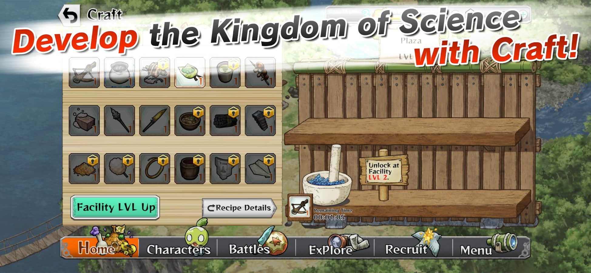 "Dr. Stone: Battle Craft" es un juego que representa la guerra entre el "Reino de la Ciencia" y el "Imperio Armado". Los jugadores pueden reunir materiales, realizar investigaciones y crear varios objetos para derrotar a los enemigos. El juego presenta personajes del popular anime "Dr. Stone": Senku, Tsukasa, Gen y otros. La batalla se lleva a cabo con un solo toque, donde los jugadores pueden lanzar bases enemigas. También hay la posibilidad de crear objetos poderosos combinando diferentes materiales para obtener una ventaja en el juego.