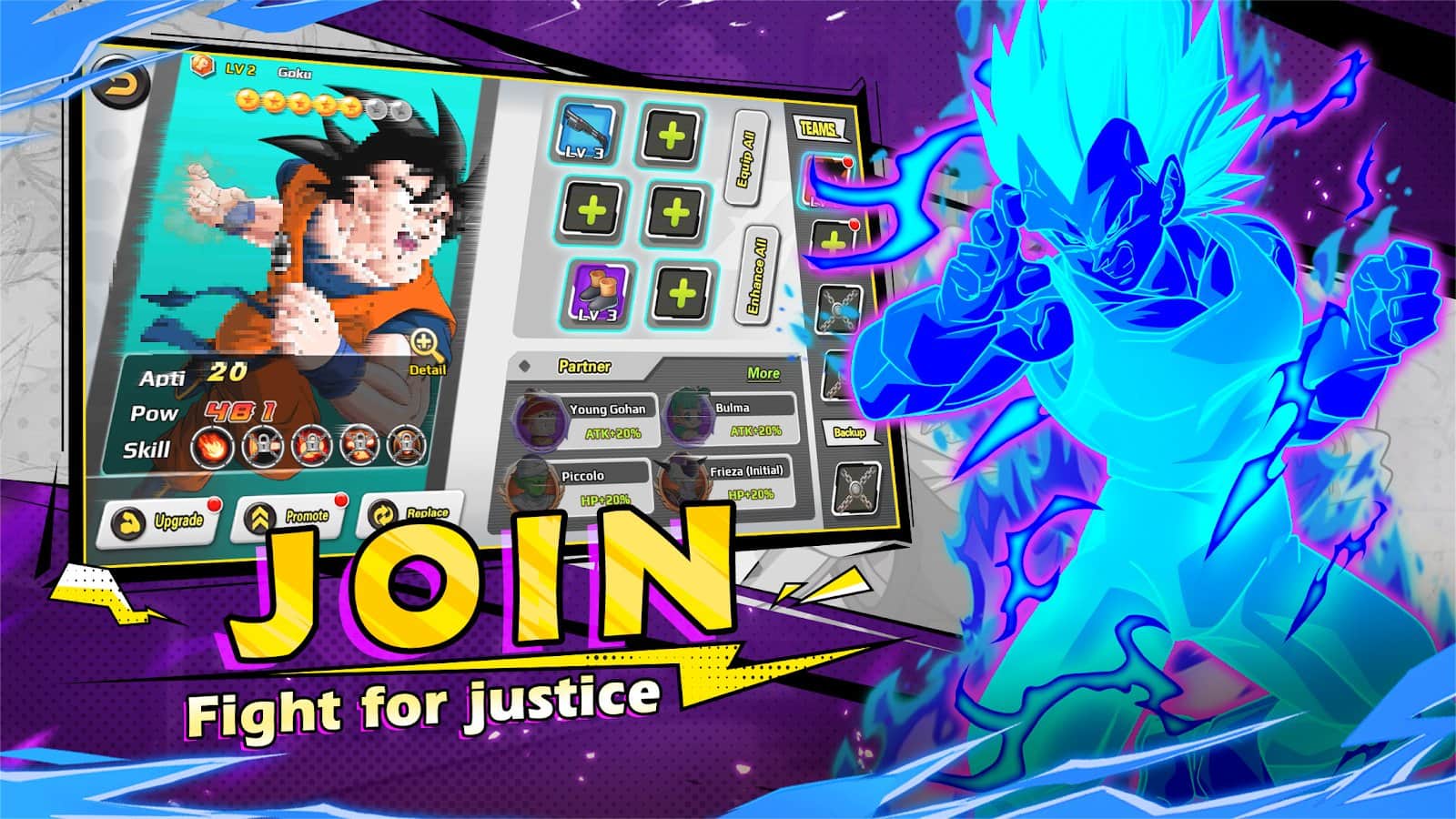 Dragon Z Warrior-Ultimate Duel es un juego de rol que tiene lugar en un universo conocido por sus poderosos guerreros. Esta vez, los jugadores controlarán a todo un equipo de luchadores mientras viajan por el mundo. La jugabilidad no se limita solo a las batallas, así que les espera el desarrollo de toda la organización y mucho más, lo que permite disfrutar del juego no solo en modo un jugador. La cooperación conjunta y el PvP no están aquí solo por estética. Gráficos hermosos deleitarán la vista tanto por su calidad como por el estilo corporativo de dibujo. Así que los fanáticos de entretenimiento original y emocionante con una larga duración definitivamente deberían probar este juego.