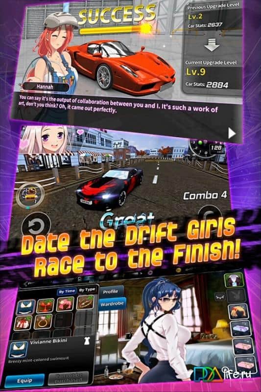 Drift Girls - un juego que sin duda puede atribuirse a una serie de reseñas "Amateur" y que en Internet tampoco está claro. Así que, según los desarrolladores, Drift Girls para Android es una carrera de derrapes con personajes hechos en estilo anime, pero la carrera en sí es de un carácter bastante menor, y en primer plano está la interacción con las pilotos de anime. En otras palabras, Drift Girls es más un juego de Sims con elementos de carreras de derrape. Pero si eres fanático del anime, de los Sims, y te gusta ver las dinámicas carreras de derrapes, entonces este juego sin duda te gustará, con docenas de seductoras chicas de anime, muchos coches que pueden realizar impresionantes derrapes y giros, la posibilidad de mejorar y, lo más importante, la capacidad de conseguir a cualquier chica en el juego.