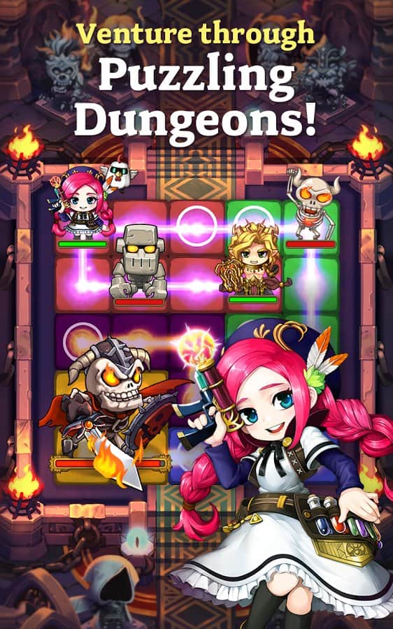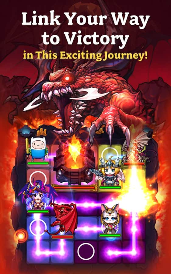Dungeon Link – RPG con elementos de rompecabezas en el que tienes que interconectar las celdas y entregar un golpe poderoso. En este juego, emprenderás un fascinante viaje a través del colorido mundo de Canterbury, que quiere capturar al rey de los demonios. Comienza tu viaje ahora y descubre los muchos héroes que pueden convertirse en tus amigos y luchar por el honor y la justicia contigo. Emplea el servicio de héroes experimentados y utiliza todo su poder contra enemigos y demonios. Fusiona tantas celdas entre sí y aplica un golpe fatal, y utiliza las fuerzas de los elementos para infligir grandes daños a los enemigos. Colecciona más de 250 personajes y crea un equipo imbatible.