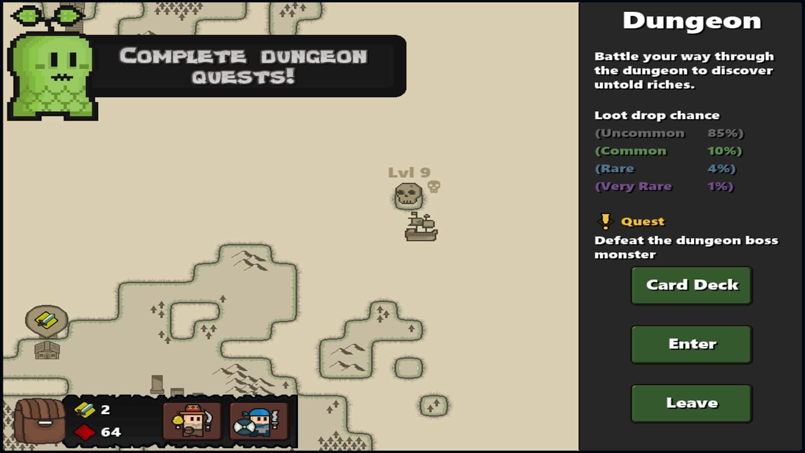 & lt;p & gt; Cazadores de Mazmorras - tu viaje comenzará en misteriosas mazmorras, donde casi todos los eventos tendrán lugar. Reúne un equipo de héroes fuertes, mejora sus habilidades, cómprales las mejores armas y armaduras, y luego emprende un viaje para luchar contra terribles monstruos. Completa tareas especiales, obtén ganancias principales y adicionales, abre una tienda para vender recursos innecesarios, colecciona varias cartas y experimenta con su combinación, elige las mejores estrategias para luchar y no temas perder.
