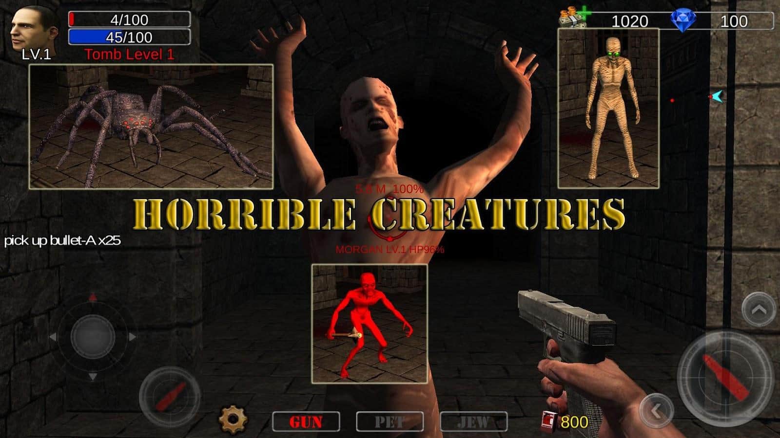 Dungeon Shooter V1.2 : Antes de la Nueva Aventura – juego de disparos en primera persona donde explorarás mazmorras peligrosas. Toma las armas y muévete a través de las mazmorras, disparando a los monstruos, animales salvajes y zombis que se acerquen a ti. La mazmorras en la que te encuentras está dividida en varias áreas y tumbas. A medida que avances por la mazmorras, los monstruos se volverán más feroces y tenaces. Obtén nuevas armas de los oponentes destruidos, doma mascotas y recoge tesoros. Consigue todos los logros y completa la misión dada.