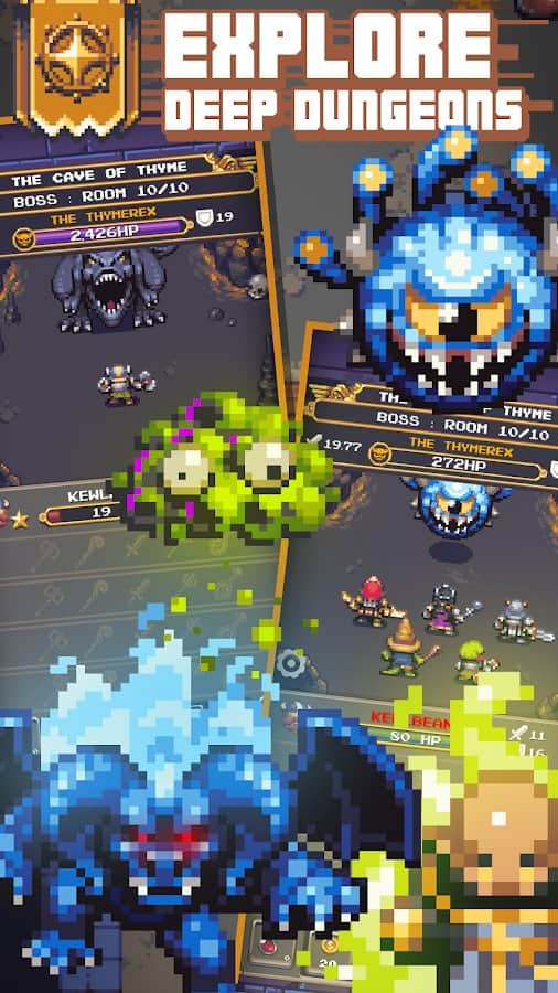 Crea tu escuadra de héroes. Explora las mazmorras. Avanza a través de estrechas cuevas y recolecta poderosas mejoras. Ayuda a mis personajes a sobrevivir. Necesitas mejorar y modernizar, para avanzar a través de las aterradoras cuevas y mazmorras con botín. Aumenta el poder de los personajes inactivos para encontrar el tesoro en la celda de píxeles. Observa a tus personajes para que tengan suficiente fuerza de brazos para sobrevivir. En las cuevas hay muchos coleccionables. Reúne todos. Lucha contra monstruos y gana. Entra en la cueva y recoge los coleccionables.