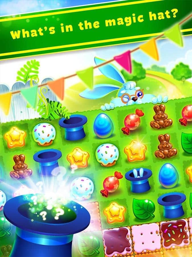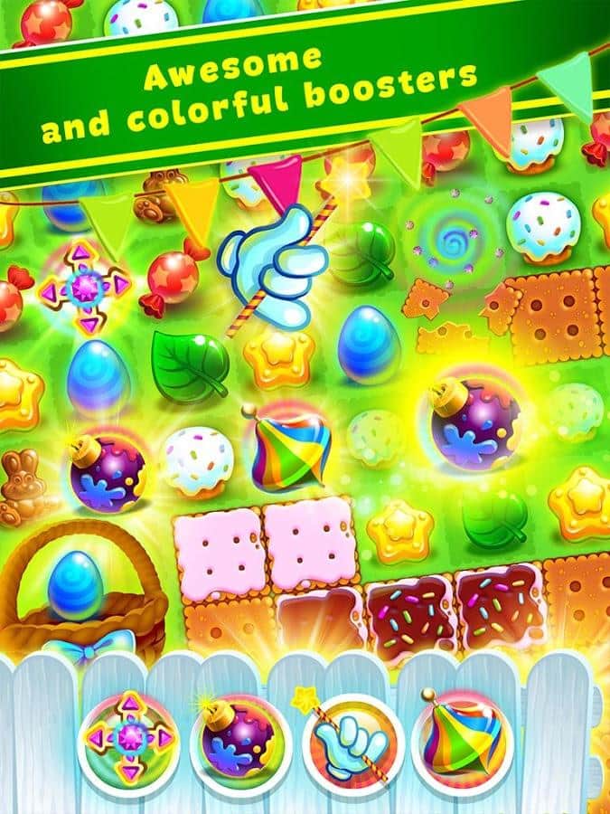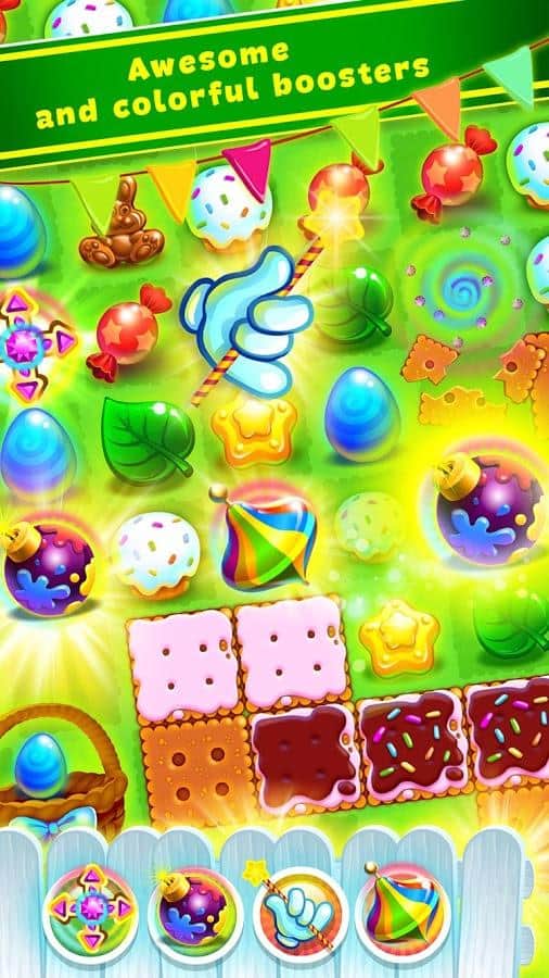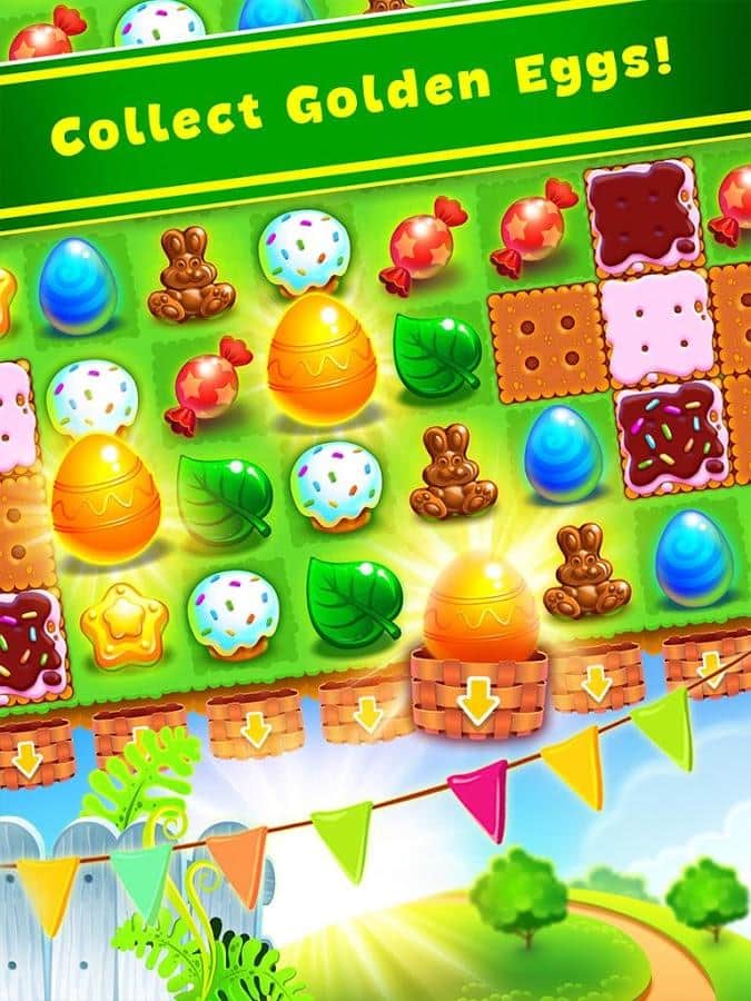 Limpiador de Pascua - Huevos - Combina 3 – combina tres o más objetos y cámbialos. En este juego serás un campo en el que hay numerosos elementos en forma de dulces, flores y huevos de Pascua. Tu tarea será crear filas largas de objetos y hacerlos estallar, liberando espacio para otros. Muestra tu perfecta reacción y atención, aprovechando al máximo las largas filas. Obtén bonificaciones de bienvenida y aplícalas para pasar los niveles del juego lo más rápido posible. Recoge huevos de Pascua y disfruta de una gran atmósfera festiva. Logra buenos resultados en este juego y establece tus propios récords.