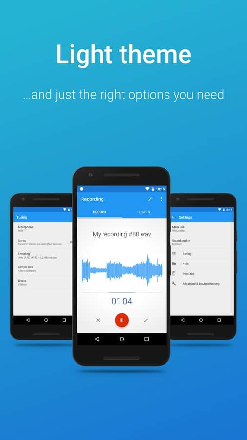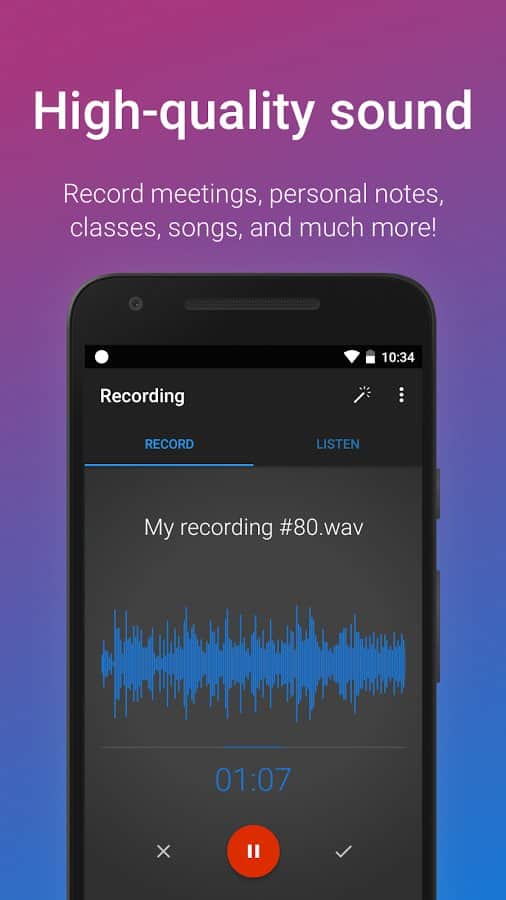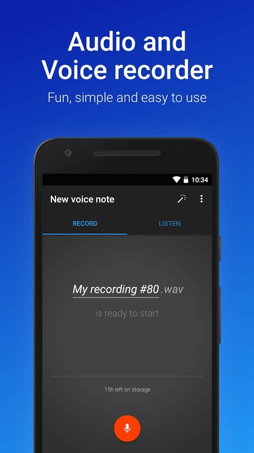 Grabadora de Voz Fácil - Esta grabadora está adaptada para reemplazar la estándar disponible. No es fácil grabar sonido, lo hará en la mejor calidad. Cuando grabes audio, escucharás incluso los más mínimos ruidos, ya que tiene una interfaz gráfica que mostrará las fluctuaciones del sonido, lo cual es muy conveniente. Como no contiene anuncios, y limita el tiempo de grabación. Así que siempre tienes suficiente, incluso para grabar largas reuniones.