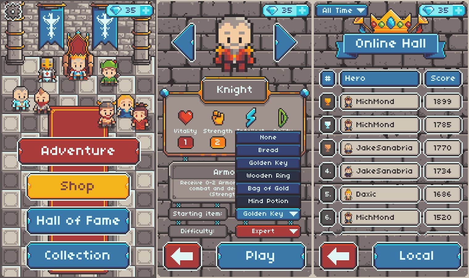 Mazmorras de Eternis - RPG Pixel Roguelike - salva a todos del terrible Señor del infierno, Astaroth. Su malvado plan era capturar la mente de los animales y las personas para reinar en la tierra, no debajo de ella. Pero su plan está arruinado por Dios, quien creó a los 8 Campeones para la victoria sobre el mal. Para pasar este interesante, pixel fácil: ante ti hay muchos caminos con diferentes premios o actividades. Cada vez se te da la opción de permanecer en el lugar, ir a la derecha o a la izquierda. A dónde irás depende de lo que harás: tomaré monedas o diamantes, tomar la llave y abrir el cofre, luchar contra monstruos normales o destruir las piedras. Al final del nivel hay jefes que necesitan ser derrotados. Con cada nivel, el mapa cambia y la complejidad aumenta.