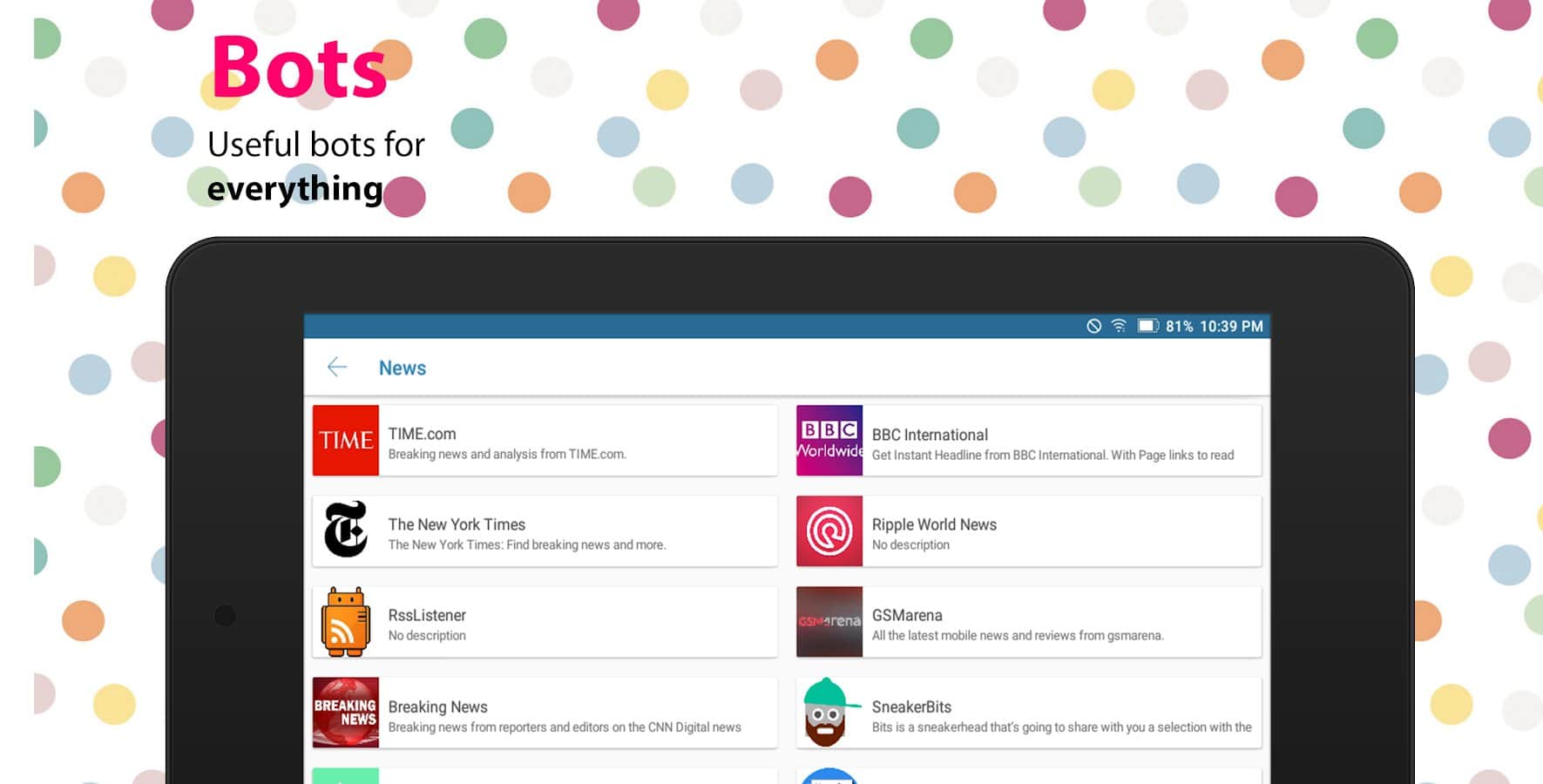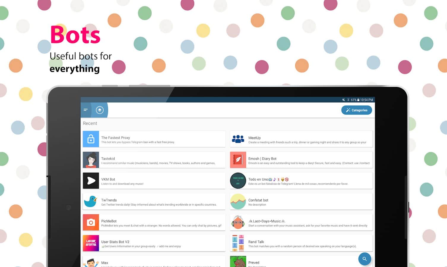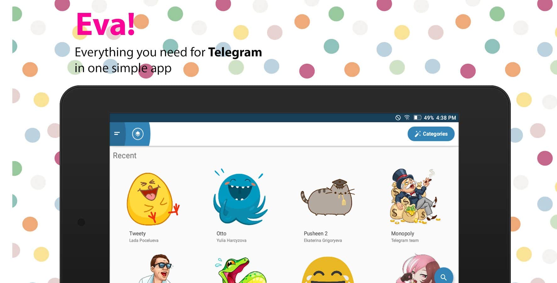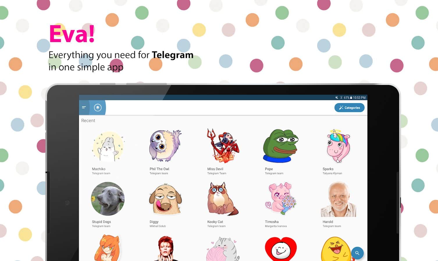 Eva: Todo para Telegram - A menudo sucede que no puedes encontrar algo relevante y útil para tu cliente de telegram. Esta aplicación resuelve este problema, ya que abarca kits de stickers, muchos grupos populares, así como un montón de bots. Instalar o configurar bots es fácil, todos tienen descripción y lista ordenada. Aquí no encontrarás nada superfluo, solo lo más importante y necesario.