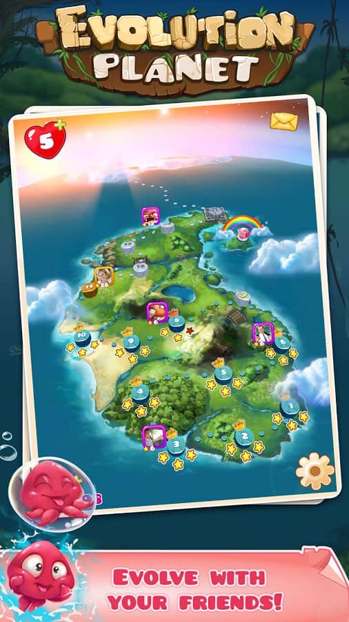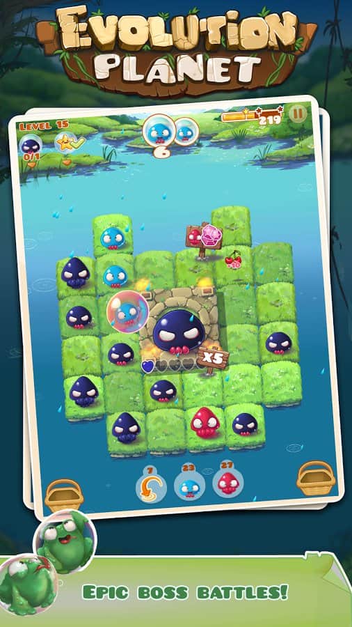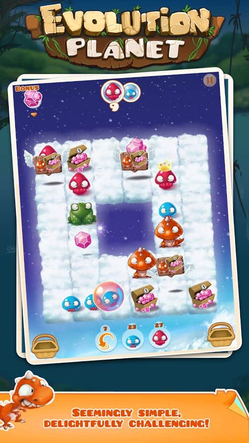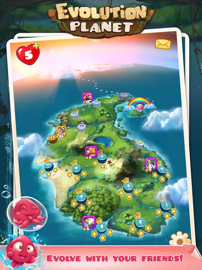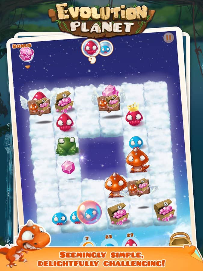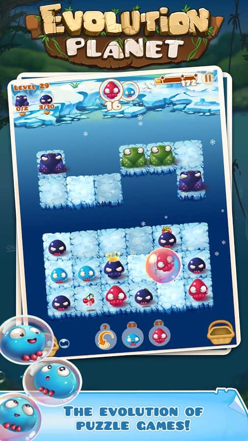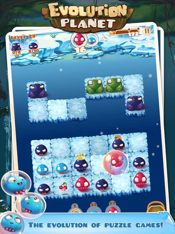 Evolution Planet – el juego te brindará experiencias inolvidables de alegría. Embárcate en aventuras en busca de tesoros junto a los alegres habitantes de pantanos y cuerpos de agua. Al pasar niveles, nos desplazamos de una isla a otra. Si combinamos tres objetos del mismo color, evolucionan en otra criatura y así sucesivamente hasta que se conviertan en ranas. Descubre todas las especies de criaturas disponibles en el juego: tres amebas se convertirán en una medusa, tres medusas se transformarán en una rana. Tres ranas evolucionan en... y así hasta que aparezca un dinosaurio. 6 magníficas y coloridas islas esperan a su jugador. En el juego hay jefes.