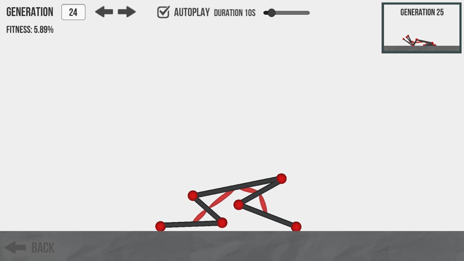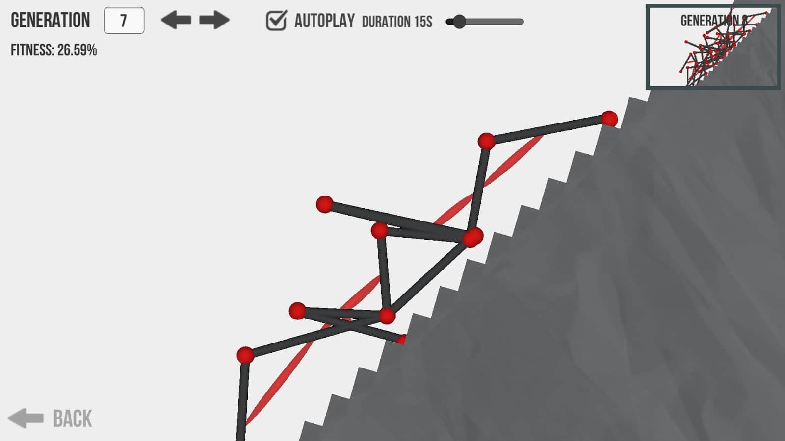 Evolución – un juego en Android donde crearás diversas criaturas combinando la red neuronal y algoritmos genéticos. Usa para crear criaturas increíbles articulaciones, huesos y músculos y obliga a tus criaturas a saltar, realizar diferentes movimientos y subir por la pared. Conecta tu imaginación ilimitada y construye criaturas increíbles para completar la tarea. Si estás interesado en la selección natural, resolver problemas y encontrar soluciones correctas, entonces este juego es para ti. Juega con tus amigos y muéstrales tus criaturas.