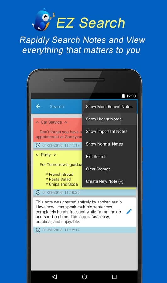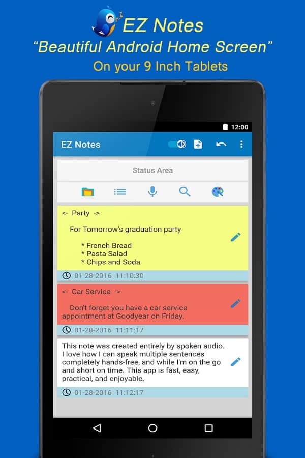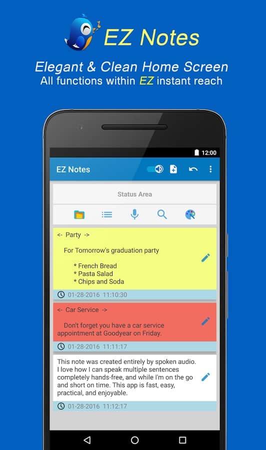 EZ Notes - El Organizador Rápido es una aplicación única para notas muy rápidas y eficientes. Con ella, puedes dejar una nota sin parpadear. Las notas son de dos tipos, aquellas que grabarás y notas de voz que se pueden dejar presionando solo unos pocos botones. La aplicación tiene una interfaz muy simple y de alta calidad y una funcionalidad flexible que te permite personalizarla a tu manera, aumentando así la velocidad con la que escribirás notas.