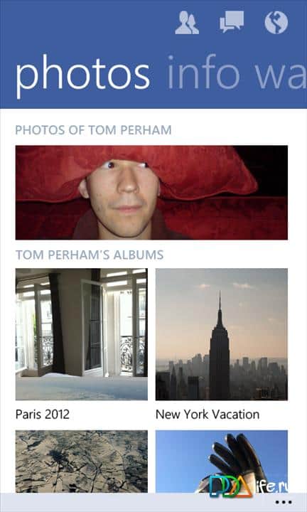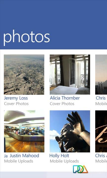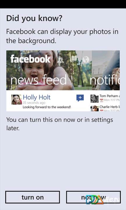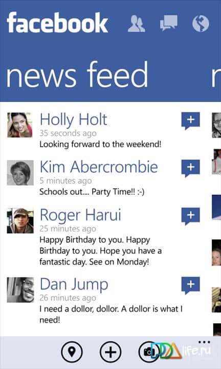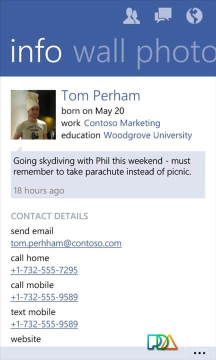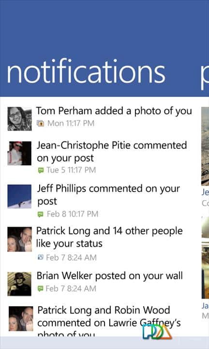 El cliente de Facebook para Windows Phone 7 proporciona a los usuarios acceso a la interfaz Metro. Cubre detalles como el botón "Me gusta" y el envío de mensajes (así como chats en grupo). Otra funcionalidad ampliada del programa está relacionada con la capacidad de etiquetar amigos y lugares en las publicaciones. Otras características incluyen la capacidad de eliminar publicaciones y comentarios y mantener presionado el botón del menú contextual, la aparición en las publicaciones de un enlace activo, y otro sistema de comentarios para fotos, y etiquetar "Me gusta" en las páginas.