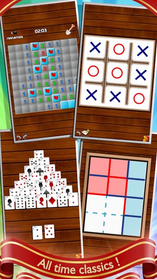 El paquete de viaje de juegos familiares es un gran juego de mesa, que reúne una variedad de juegos de mesa tradicionales. En este juego encontrarás juegos como: ajedrez, damas, backgammon, Reversi, solitario, golf, Freecell, póker, cuadrados y muchos otros. Este juego puede jugarse simultáneamente hasta seis personas en un dispositivo. Además, hay un modo Wifi y Bluetooth donde puedes jugar con amigos y otros jugadores de todo el mundo. Sube más alto en la tabla de clasificación y mejora tus habilidades en diferentes juegos.