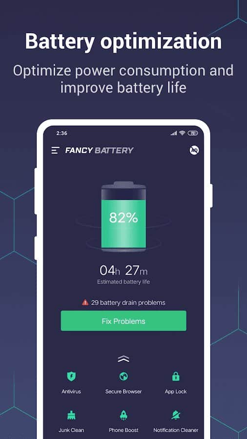 Fancy Battery - Ahorro de batería, aceleración - ¡Elimina absolutamente todos los tipos de basura y libera espacio de almacenamiento adicional para información importante! En esta práctica aplicación encontrarás: un limpiador de historial en Internet, eliminación de la llegada de notificaciones innecesarias, escaneo antivirus profundo y limpieza automática del motor de archivos maliciosos, bloqueo de la aplicación con un código PIN o una clave gráfica, aumento de la duración de la batería y optimización máxima del consumo de energía. ¡Escanea las direcciones disponibles en tu teléfono y ordénalas!